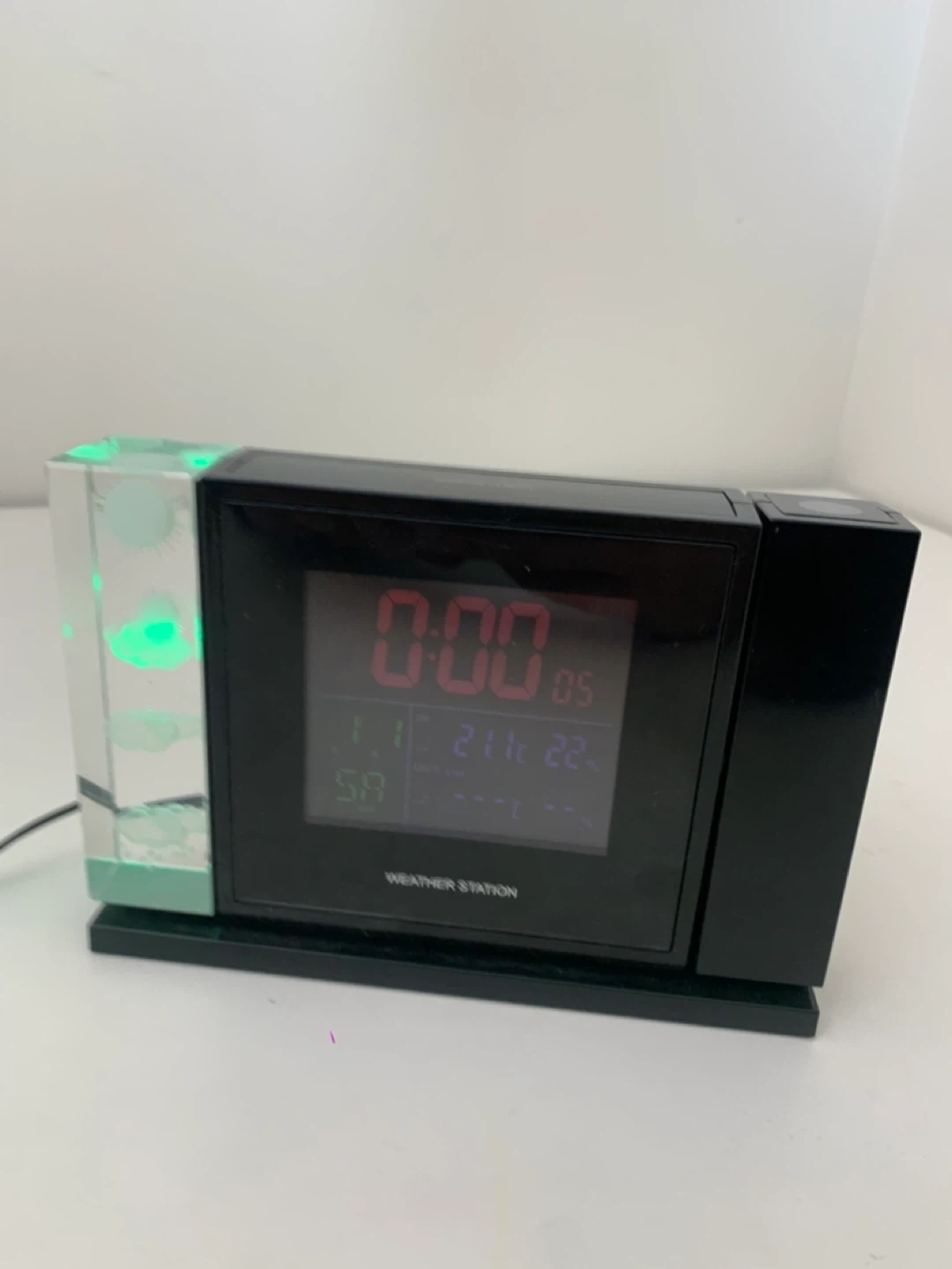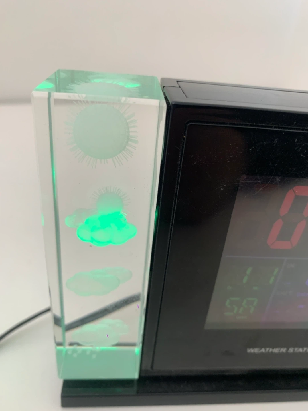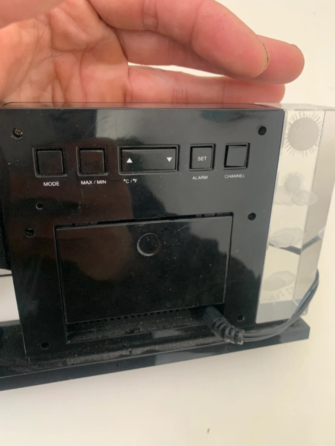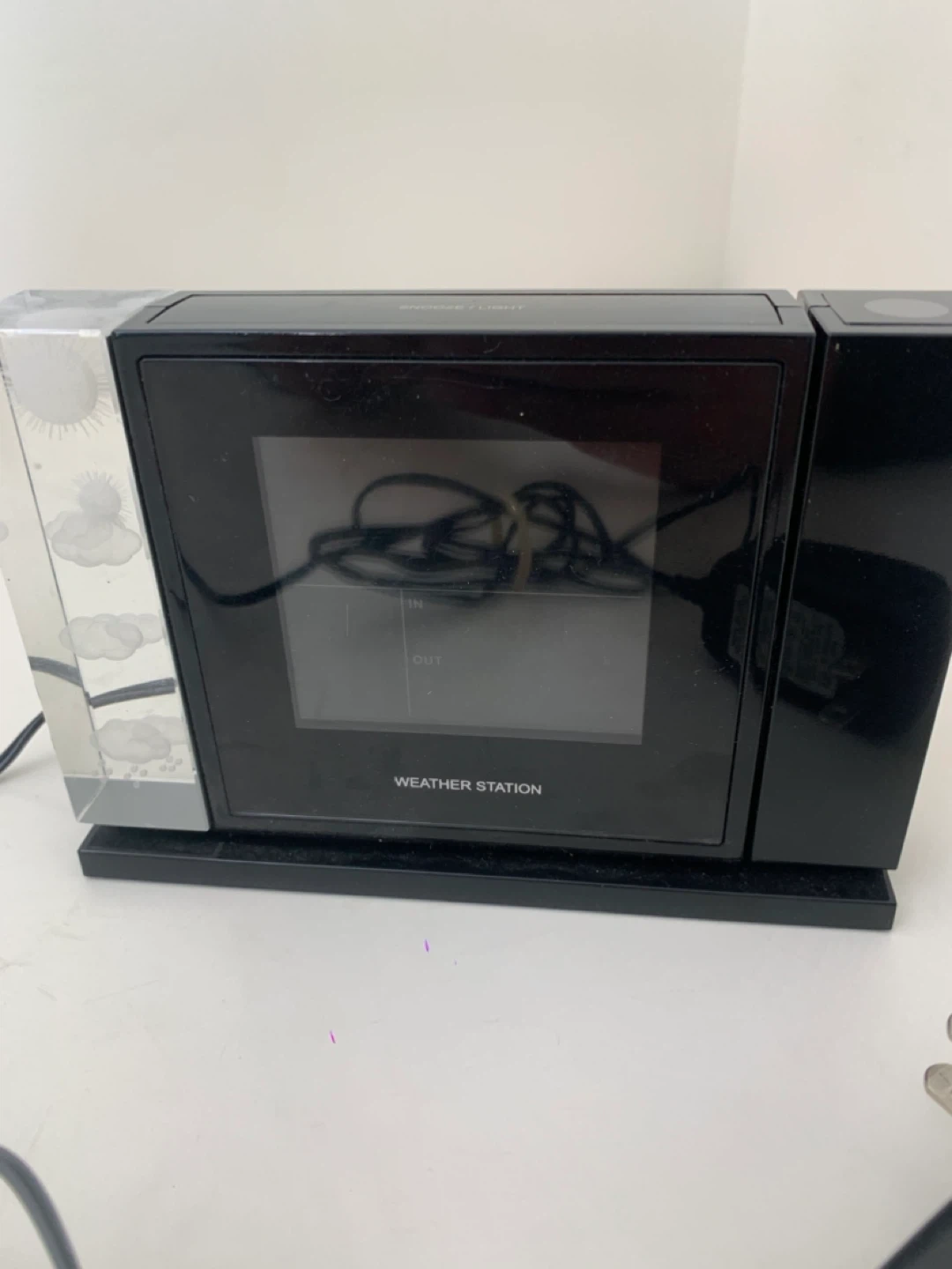 Selling a weather station clock! It displays the time, indoor and outdoor temperatures, and has a cool light-up weather display on the side. Comes with the power adapter