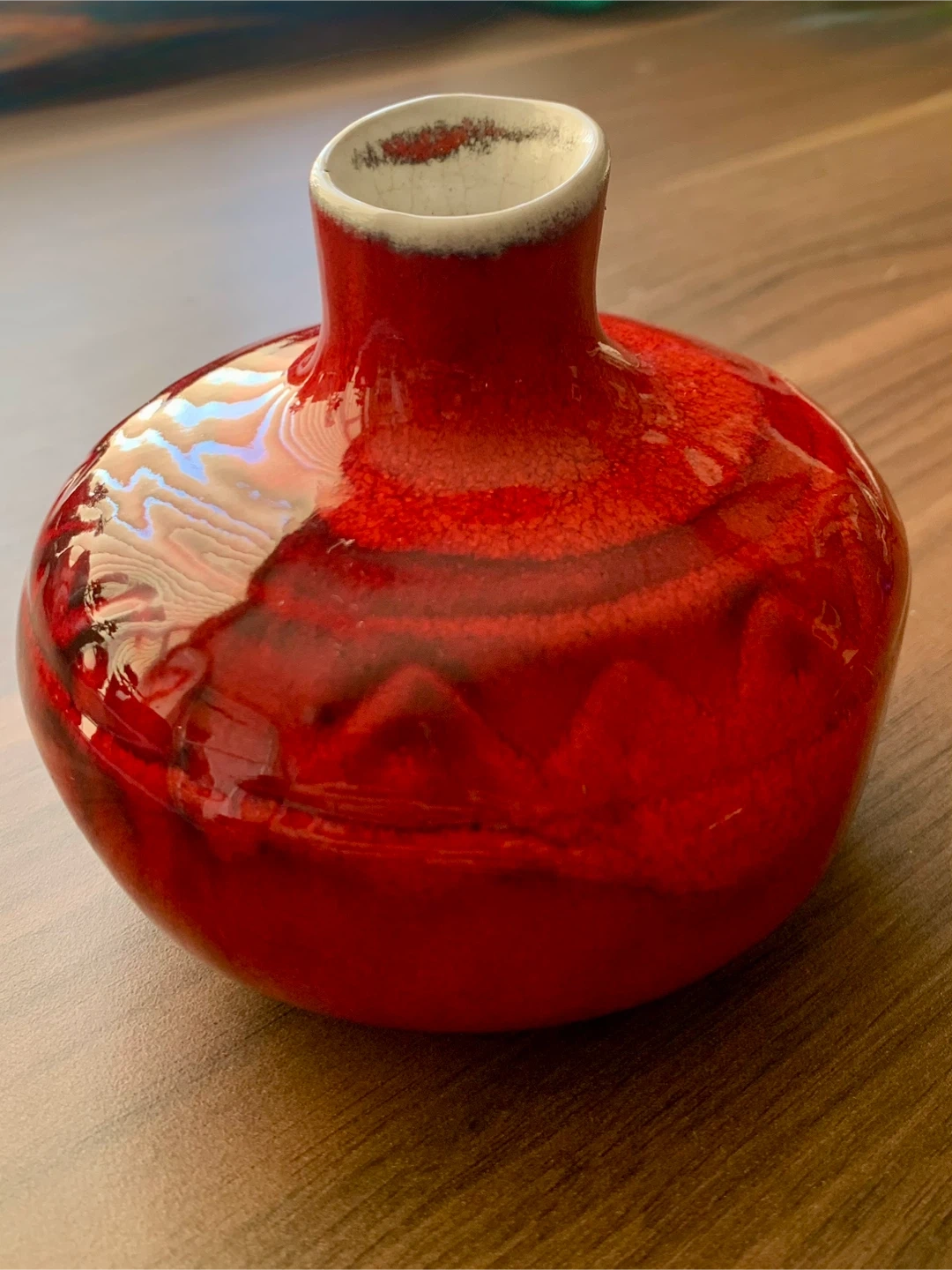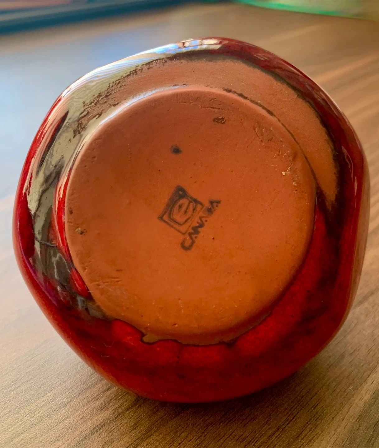 Add a vintage touch to your home with this Estriceram Canada redware vase! This handcrafted ceramic piece features a rich red glaze and subtle textured detailing. Its narrow neck and bulbous base give it a distinctly mid-century modern silhouette, perfect for minimalist or retro-inspired interiors. It stands approximately 4 inches tall and 4 inches in diameter