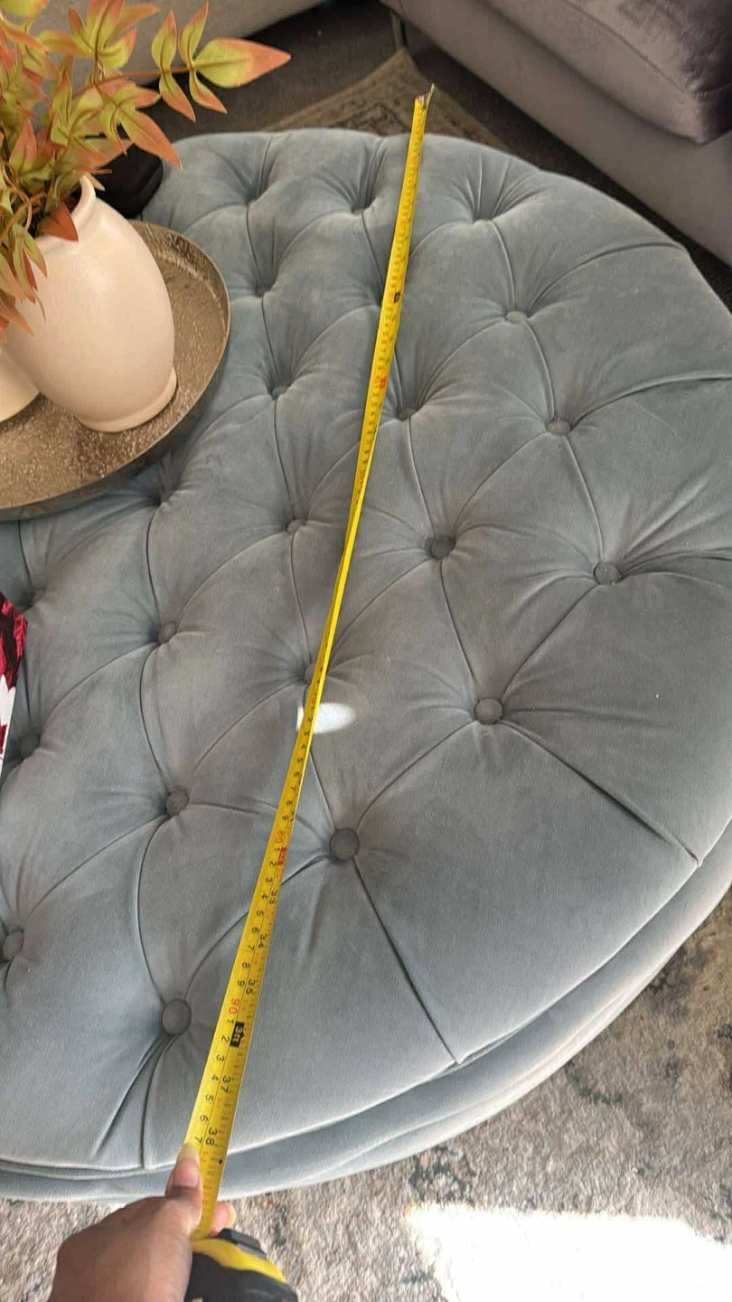 Selling a lovely tufted round ottoman in a light blue colour! It's in great shape and would look fantastic in any living room or bedroom. It measures approximately 38 inches in diameter