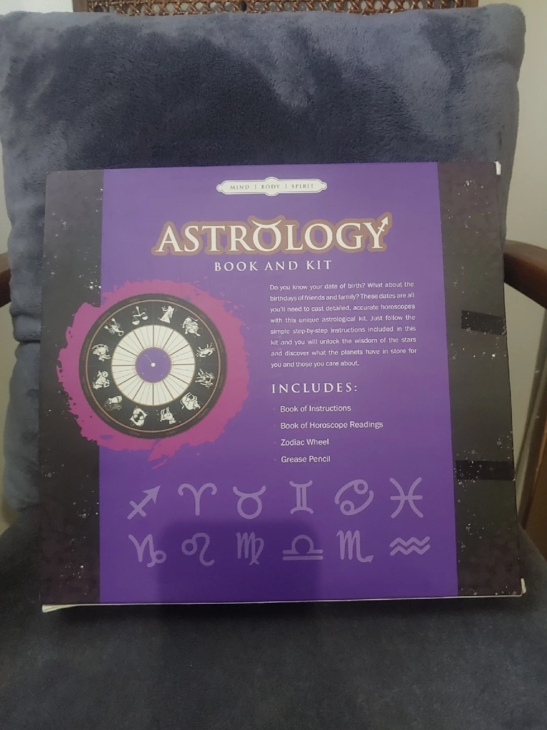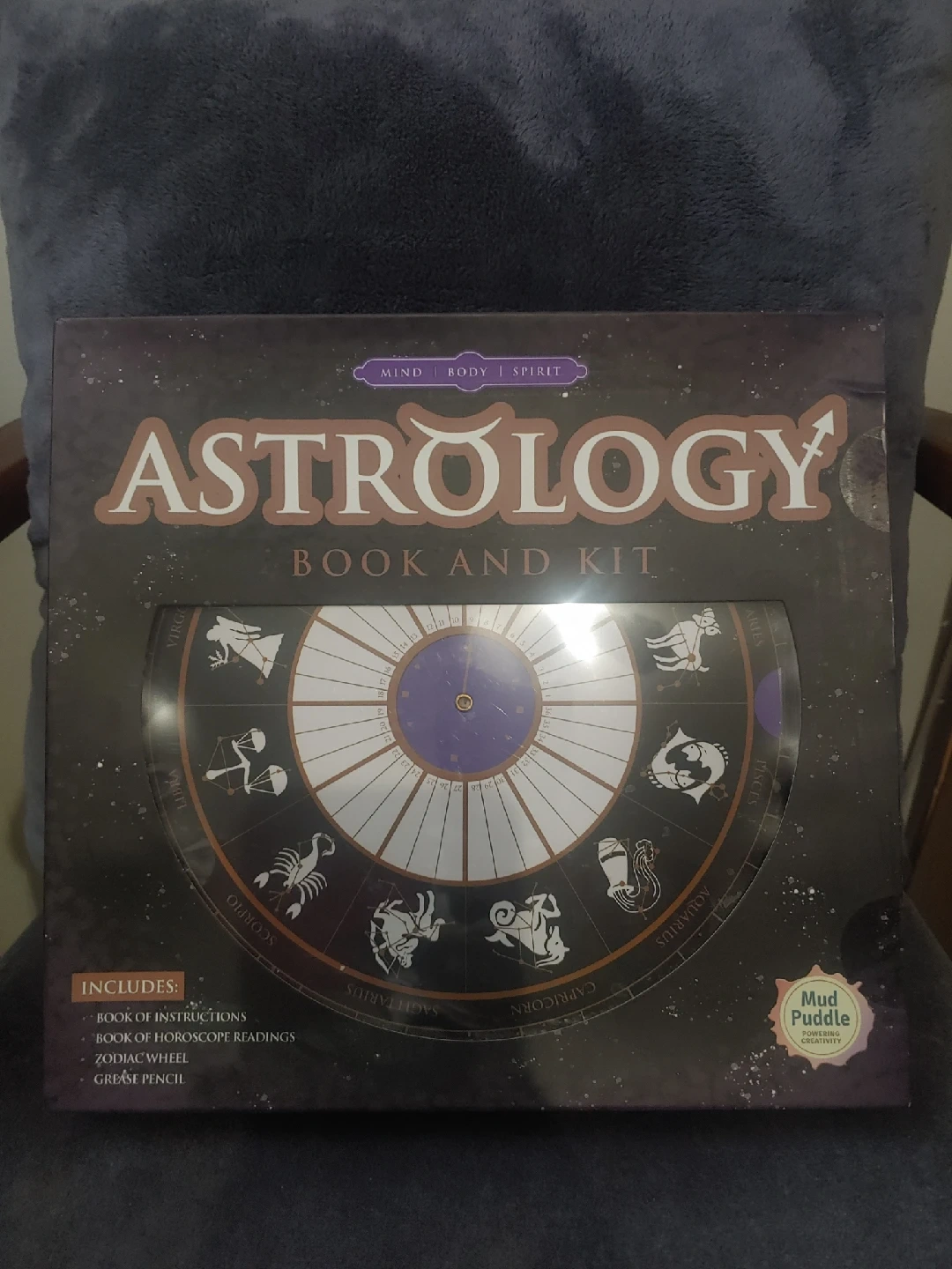 Selling a brand new Astrology Book and Kit from Mud Puddle! It includes a book of instructions, a book of horoscope readings, a zodiac wheel, and a grease pencil. Perfect for anyone interested in astrology!