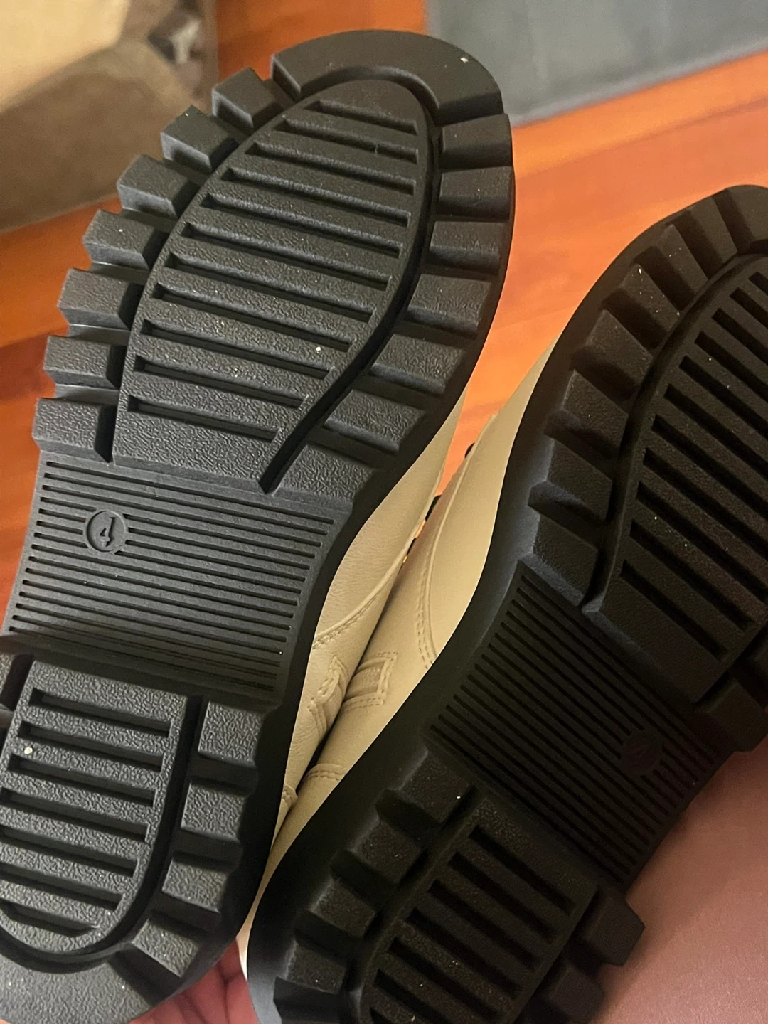 These are a pair of ankle boots in white with black laces and soles. They are a size 4. For kids