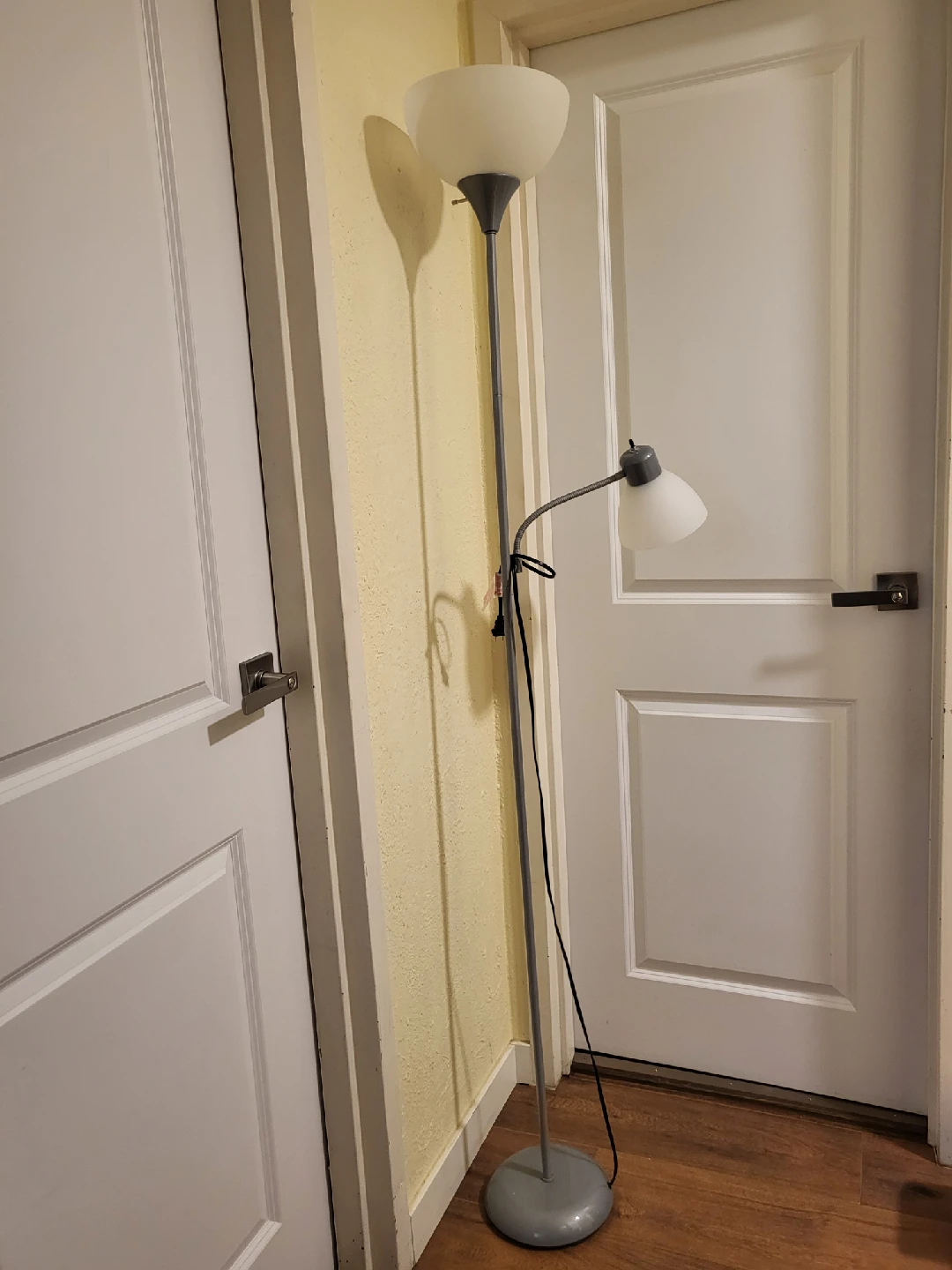 Selling a floor lamp with an attached reading light. It's in good condition and would be perfect for a living room or bedroom. The lamp features a tall, slender design with a white lampshade and a smaller, adjustable reading light attached to the side.