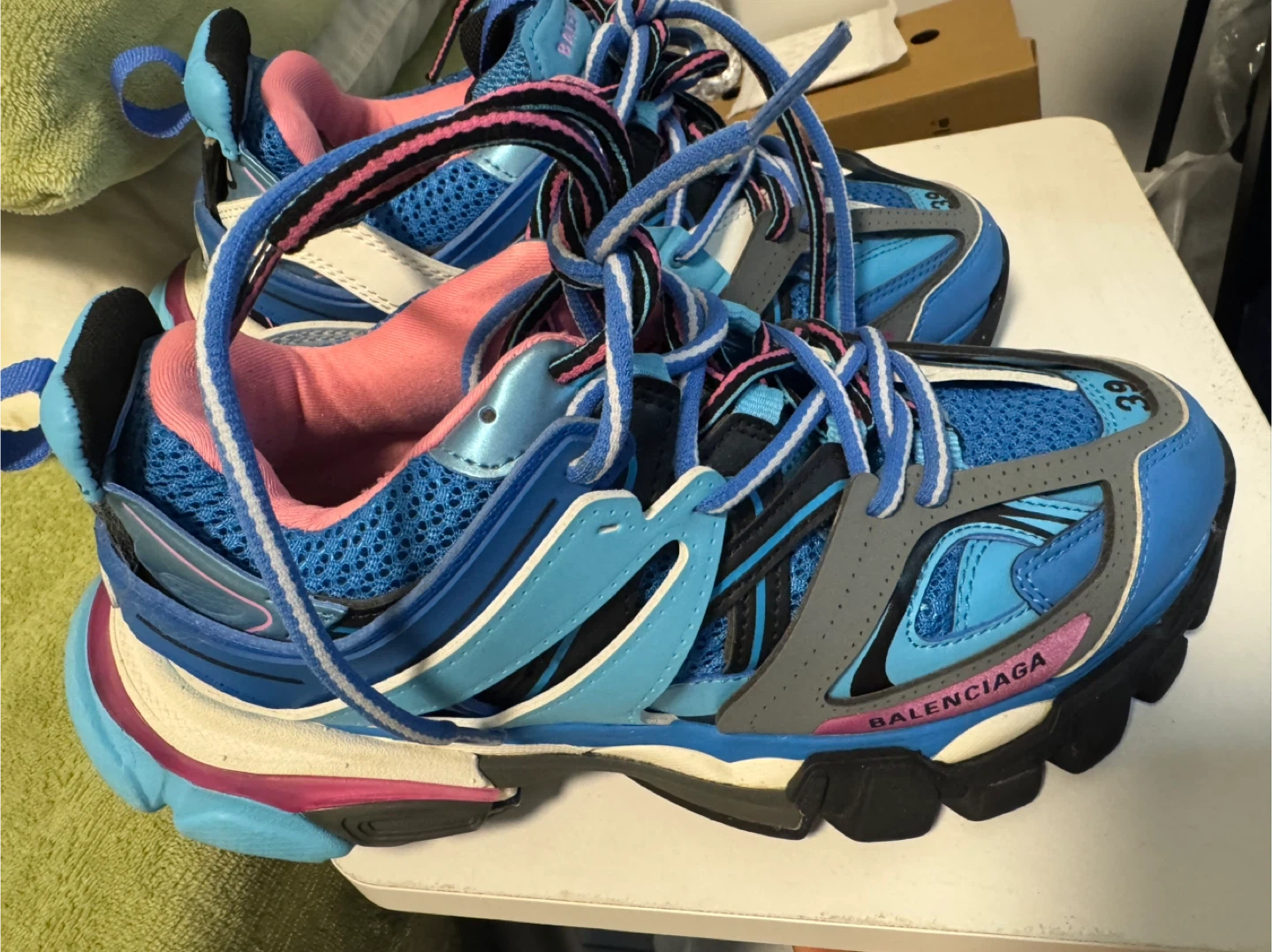 Selling a pair of Balenciaga Track sneakers in a blue and pink colourway. The shoes are in good condition and are a size 39.