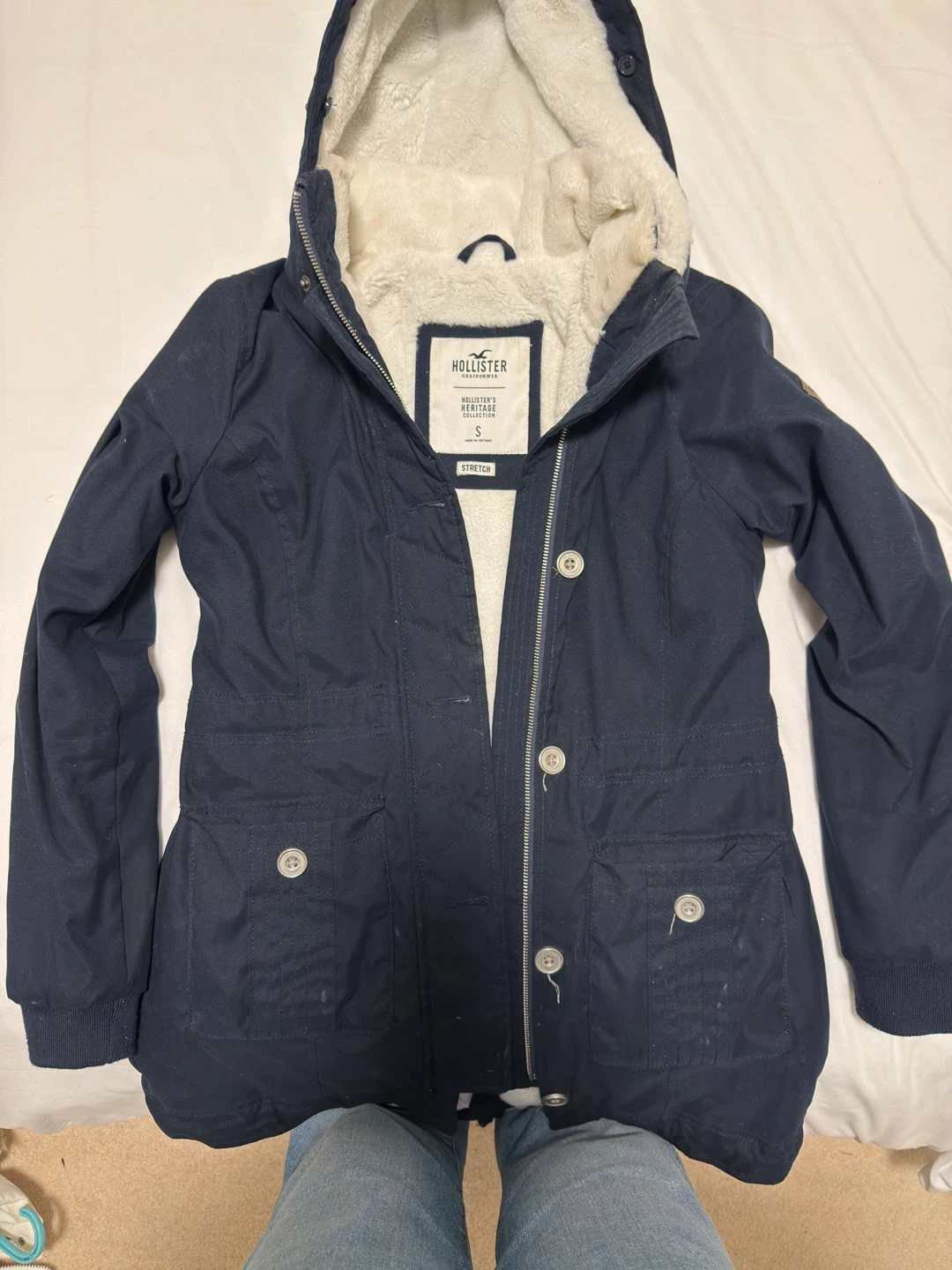 I'm selling a Hollister Heritage Collection parka in a dark blue colour. It's a size small and features a soft, warm lining. Perfect for those chilly days!