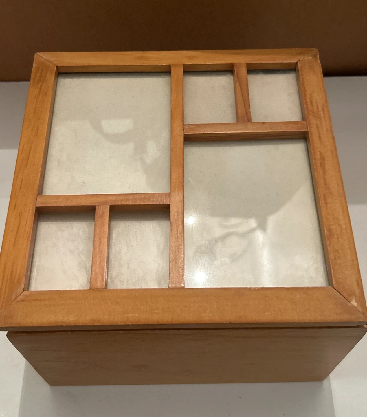 Giving away a wooden box with a unique photo frame lid! It has several compartments for photos and a storage area inside. Perfect for keepsakes or small items.