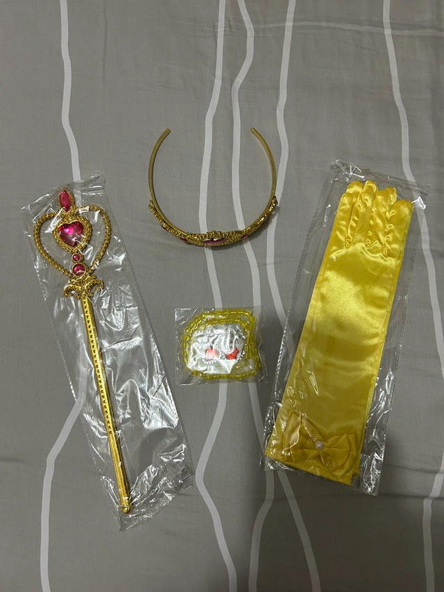 Complete your princess look with this enchanting set of costume accessories! This set includes a gold-tone crown necklace, a magical wand with a pink heart, yellow gloves with bow accents, and a charming coin purse. All items are in new condition, still sealed in their original packaging, ready to add that perfect touch of royal flair to any outfit or costume. * Gold-tone crown necklace * Magical wand with a pink heart * Yellow gloves with bow accents * Charming coin purse Looking at similar listings on Kijiji, a reasonable price for this set is around $5. If the ad is up, the item is available, so feel free to reach out and claim your royal accessories!