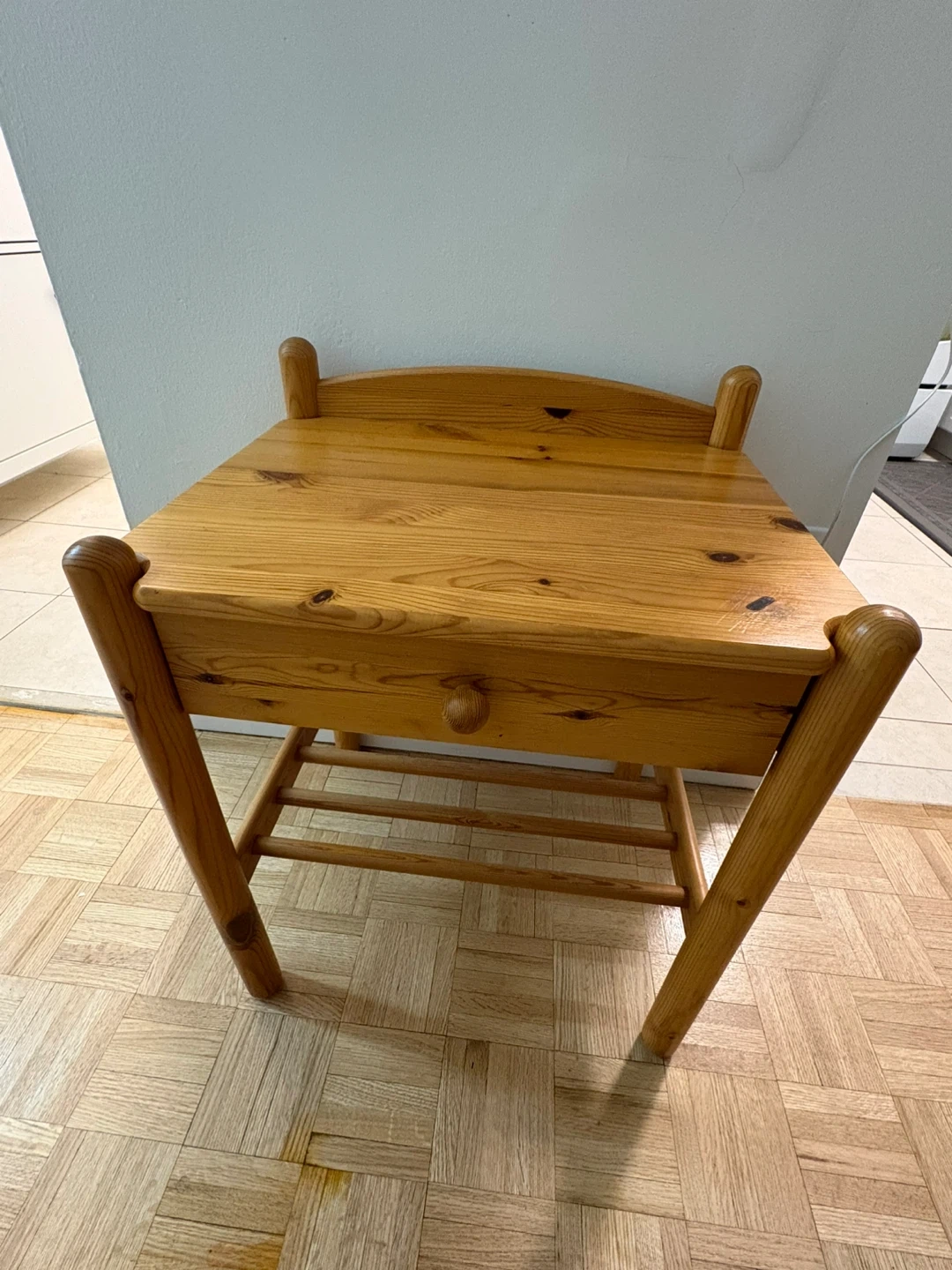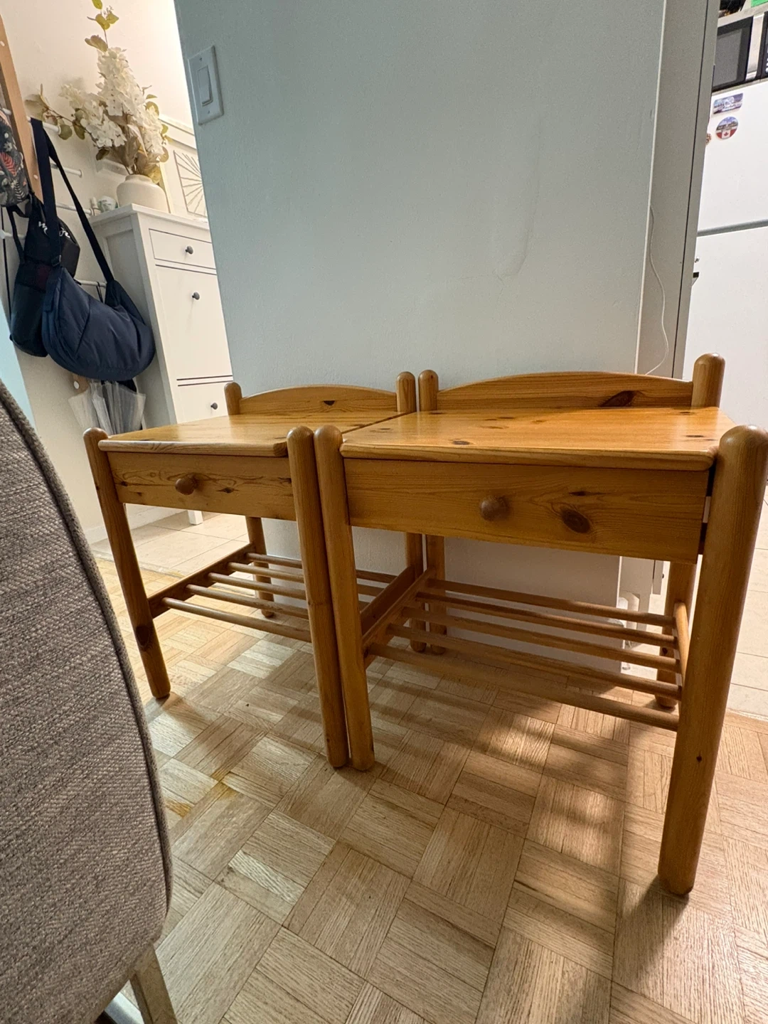 Selling two nightstands in natural wood with a classic and functional design. They have a drawer and a shelf, perfect for adding a warm and modern touch to your bedroom. $60 for both