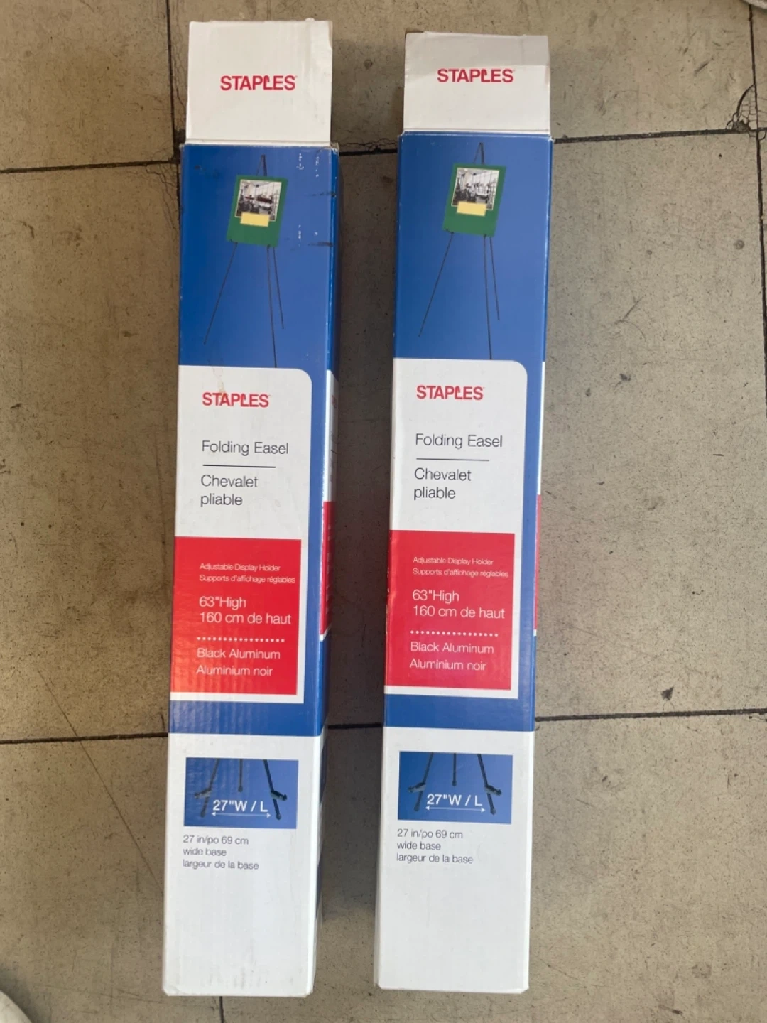 Selling 2 Staples folding easels. It's 63" high (160 cm) and made of black aluminum. The base is 27" wide (69 cm). It's an adjustable display holder.