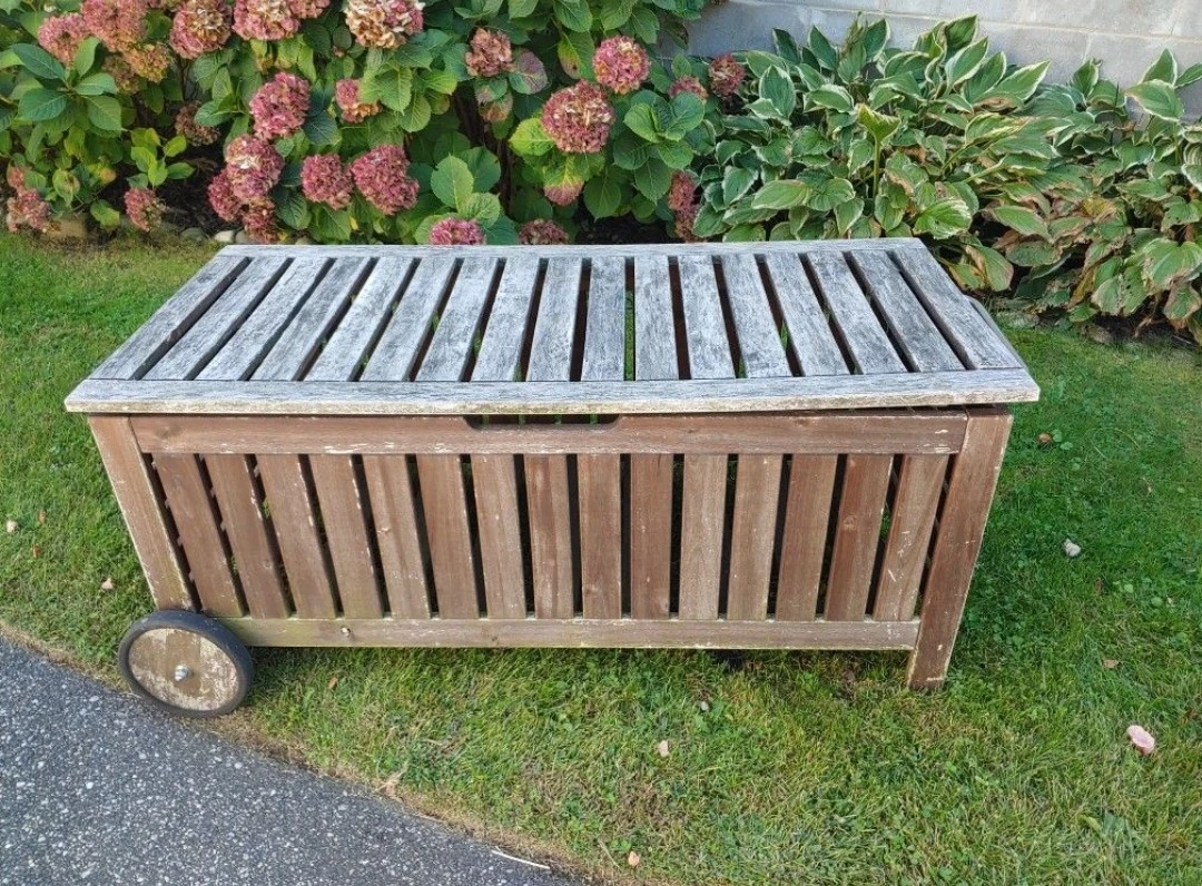 This is a wooden outdoor storage box. It has wheels & metal handle for easy moving. It's great for storing outdoor items.