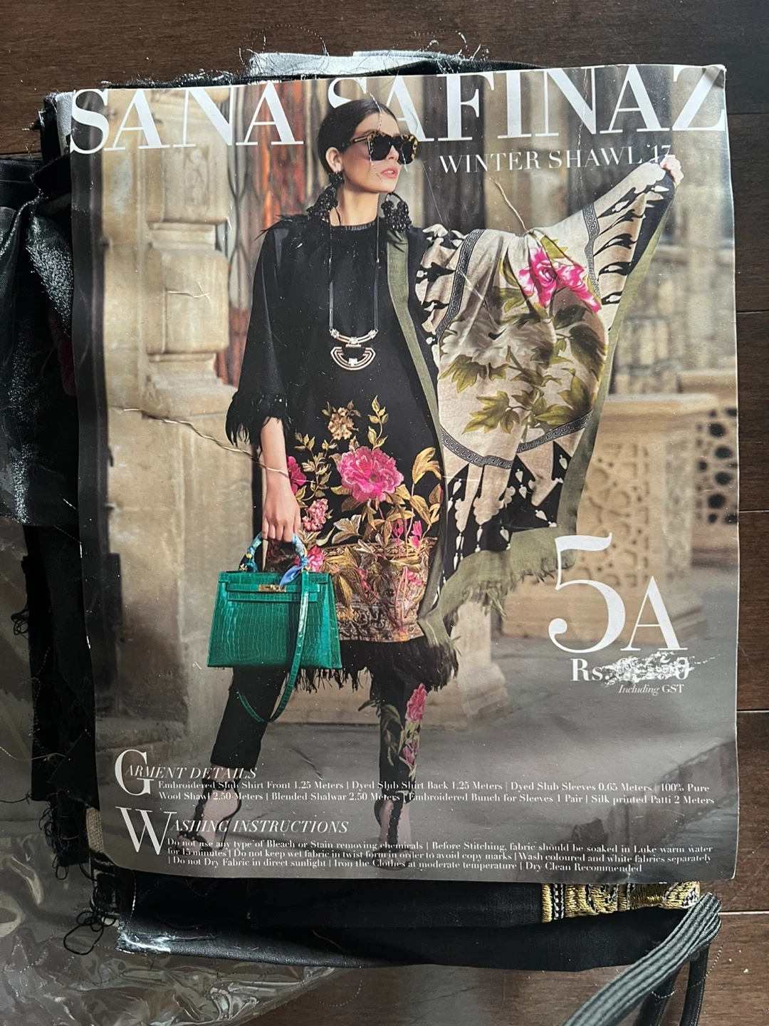 Selling a Sana Safinaz Winter Shawl '17. The garment details include embroidered slub shirt front, back, and sleeves, along with embroidered bunches for sleeves and a pair of silk printed patti. Perfect for adding a touch of elegance to your wardrobe!