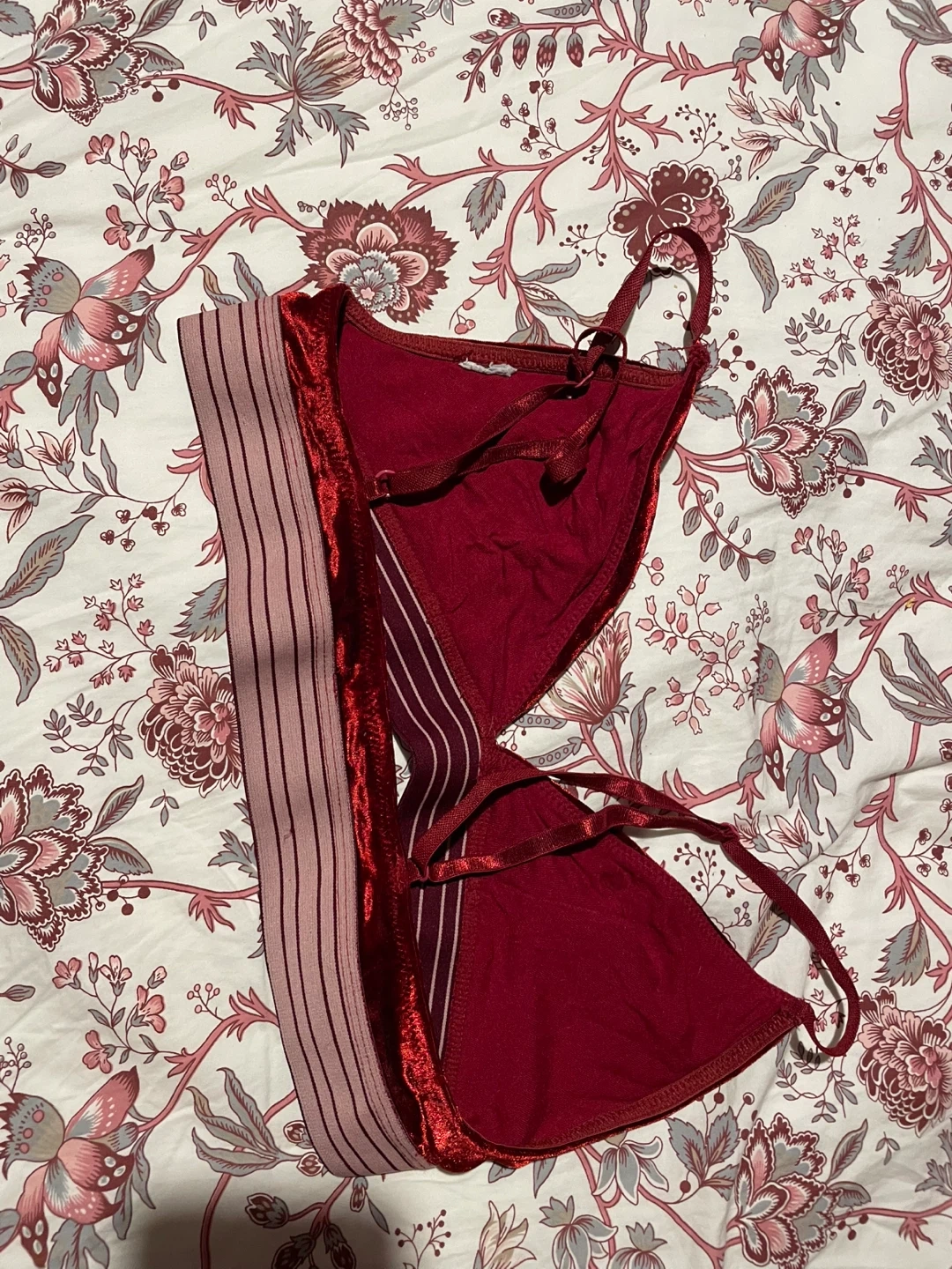 Selling a red velvet bra. The material is soft and comfortable. Lightly used sports bra/ bralette. Fits A-B maybe C.