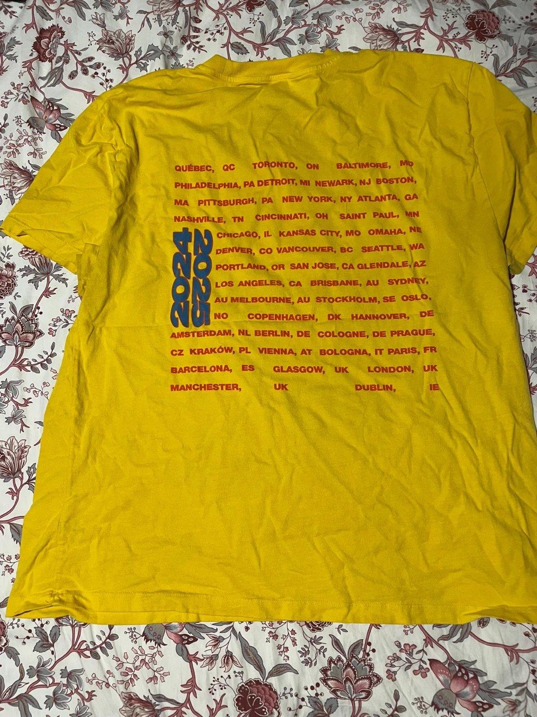 Selling a Billie Eilish tour t-shirt from the 2024 tour! It's a bright yellow and in size XL. The shirt is made of 100% recycled cotton and features tour dates on the back. It's in great condition!
