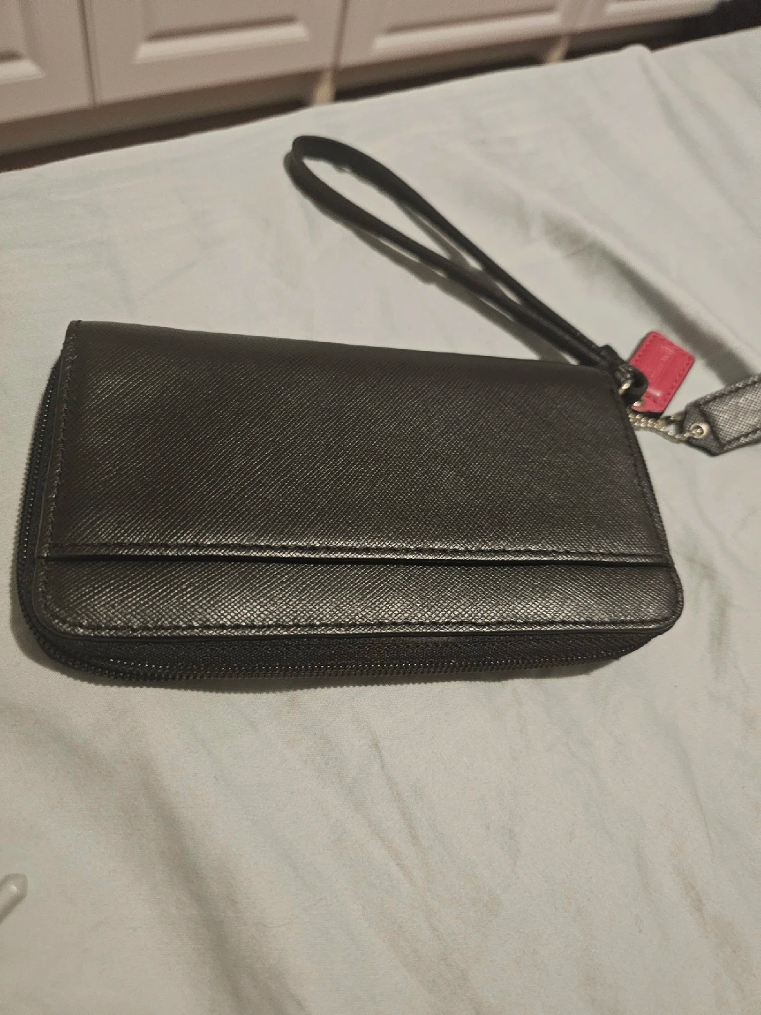 Selling a Coach wristlet wallet in black! It's in great condition and perfect for carrying your essentials. Has card slots and a zippered closure to keep everything secure
