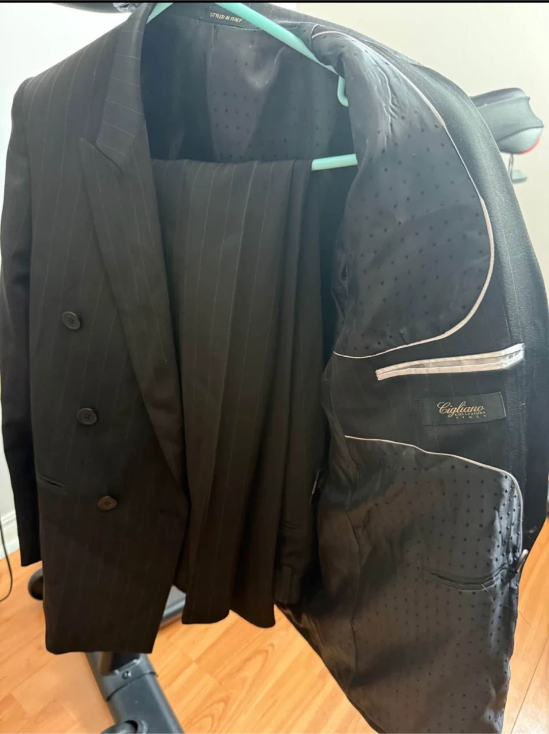 15Here's a stylish pinstripe suit from Cigliano Napoli. It's in great condition and ready for a new home! The lining is a cool dotted pattern. Has not been hemmed