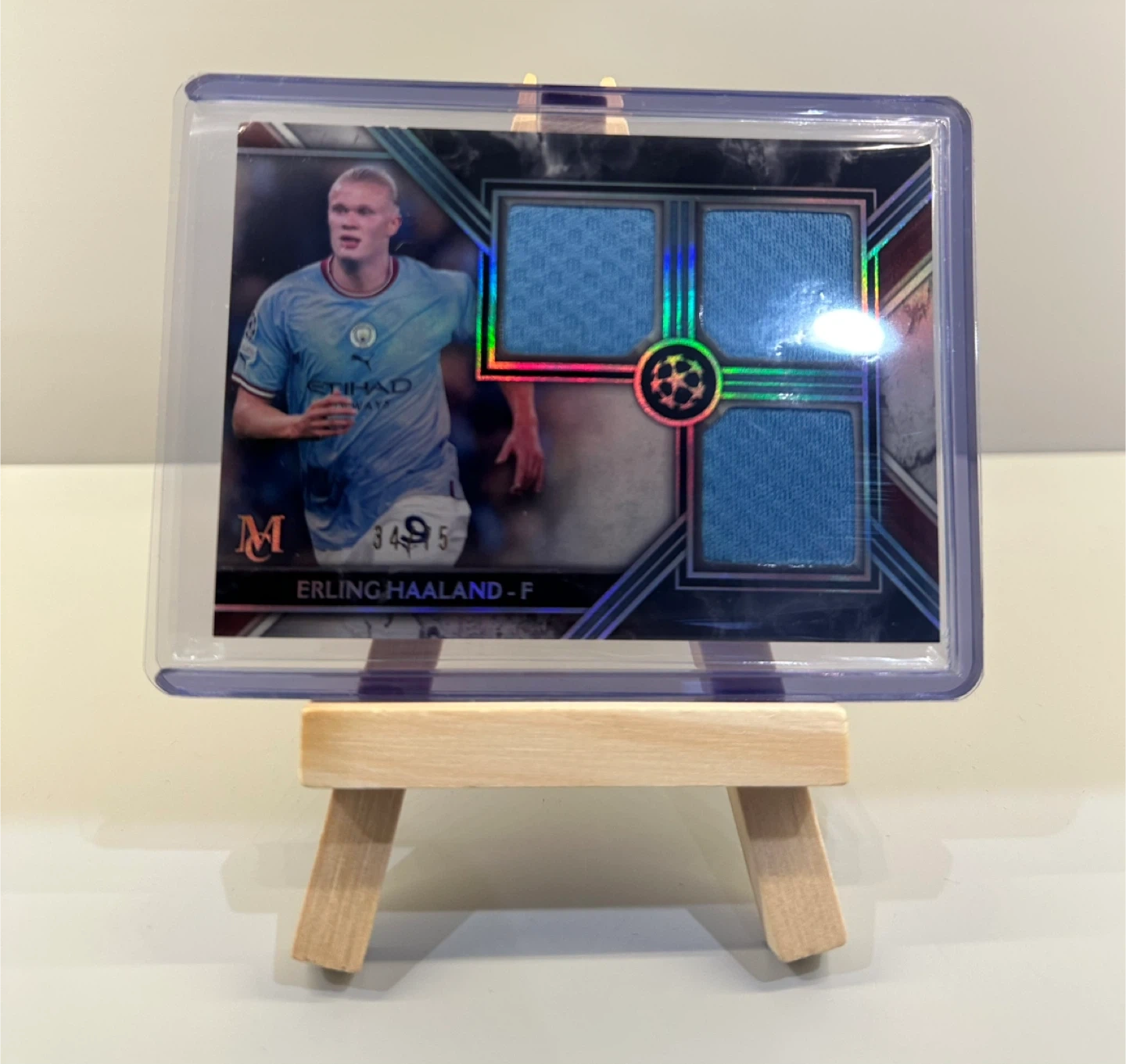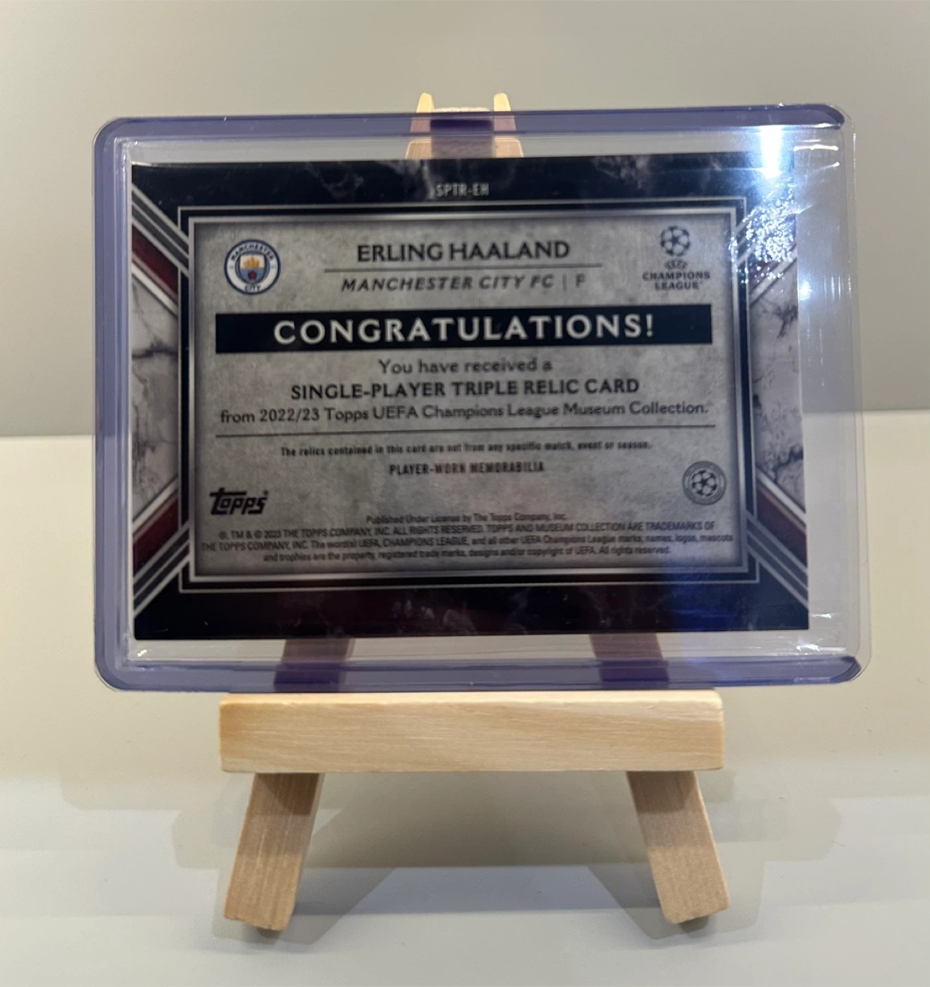 Selling an Erling Haaland Manchester City FC Topps UEFA Champions League Museum Collection Single-Player Triple Relic Card! It's from the 2022/23 season and contains player-worn memorabilia