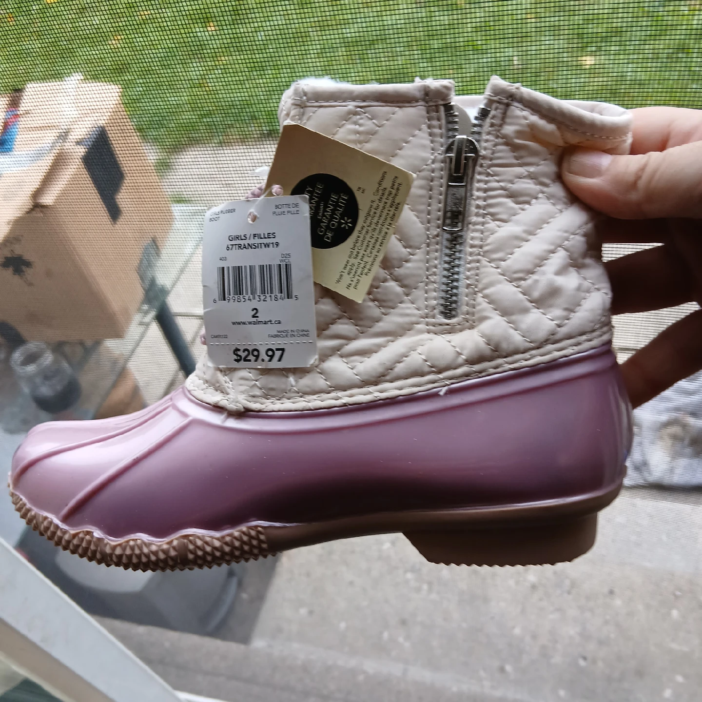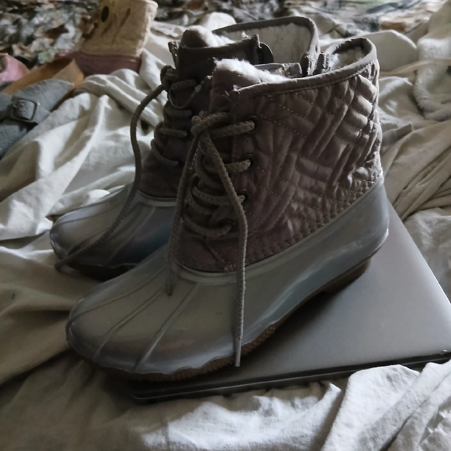 These duck boots are in excellent condition, brand new! They feature a stylish quilted design and a convenient zipper closure. Originally bought for $29.97, these boots are ready for some fun in the snow or rain.