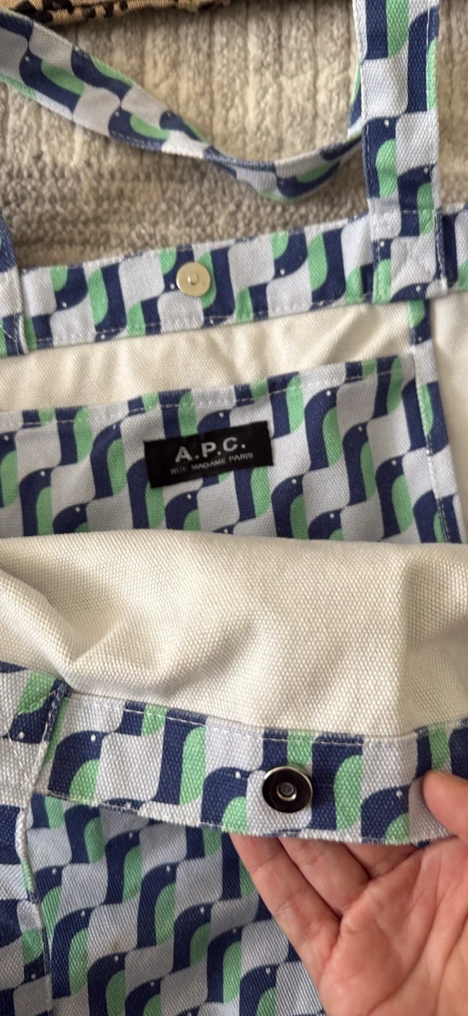 Two tote bags for sale! One is a fun leopard print and the other has a geometric design in blue, green, and white. Both are in great condition and ready for a new home