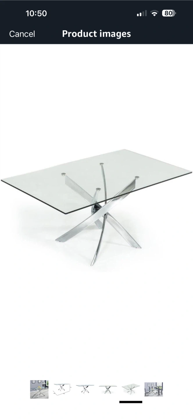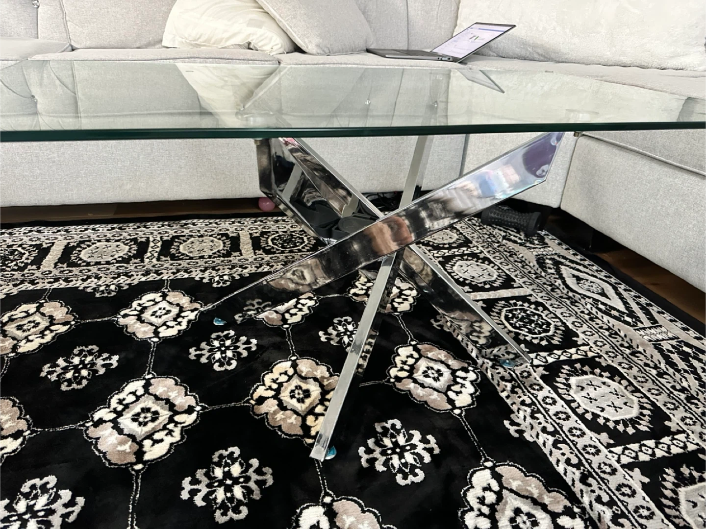 I'm selling a glass coffee table with a silver-finished base, offering a modern touch to any living space, along with two matching side tables. The set is in great condition.