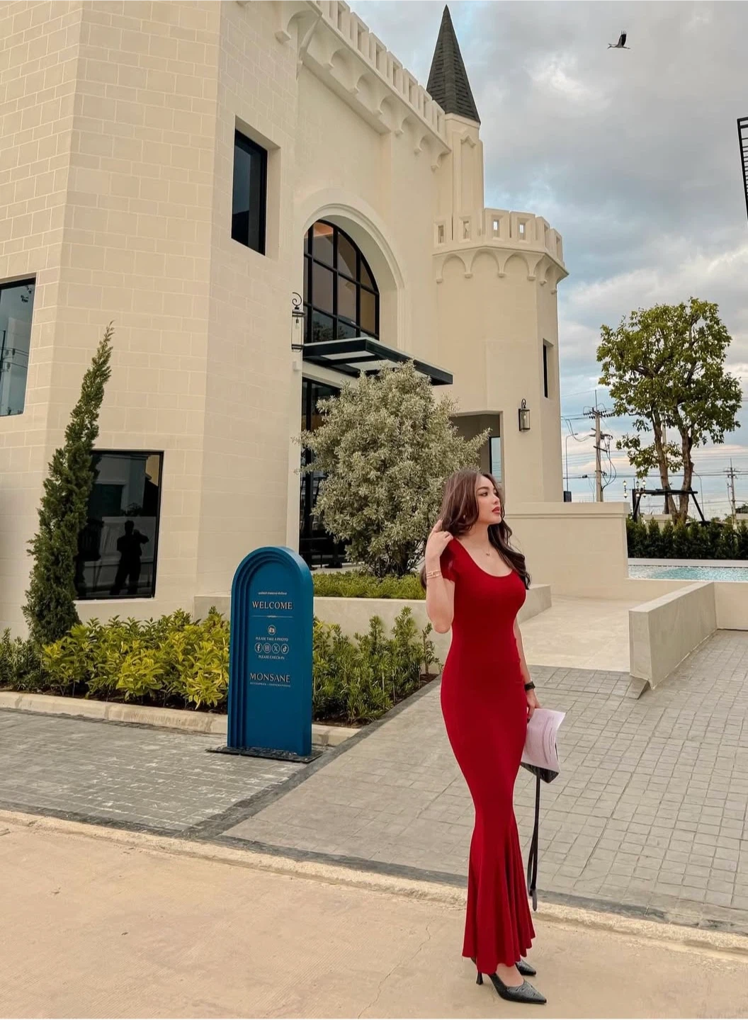 A lovely burgundy maxi dress! It features a flattering silhouette with short sleeves and a flared bottom. Perfect for a special occasion or a night out