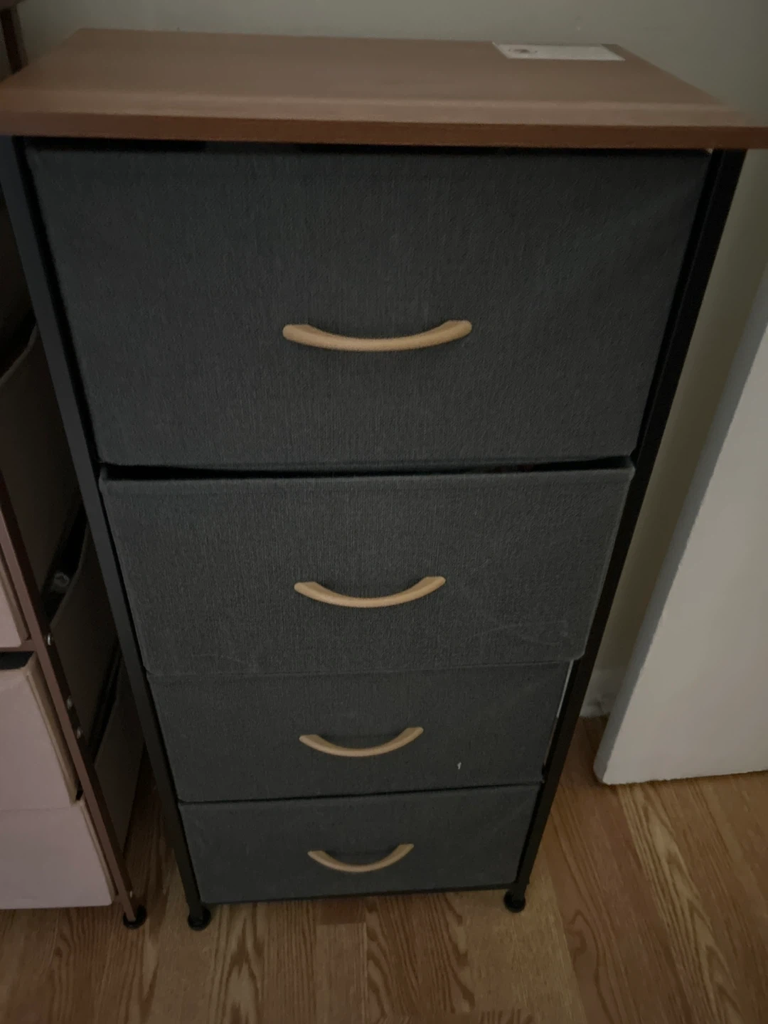 I'm selling a gray fabric 4-drawer storage tower. This is a great storage solution for any room! It features a sturdy frame and four fabric drawers, perfect for organizing clothes, accessories, or household items only one drawer is letle reep