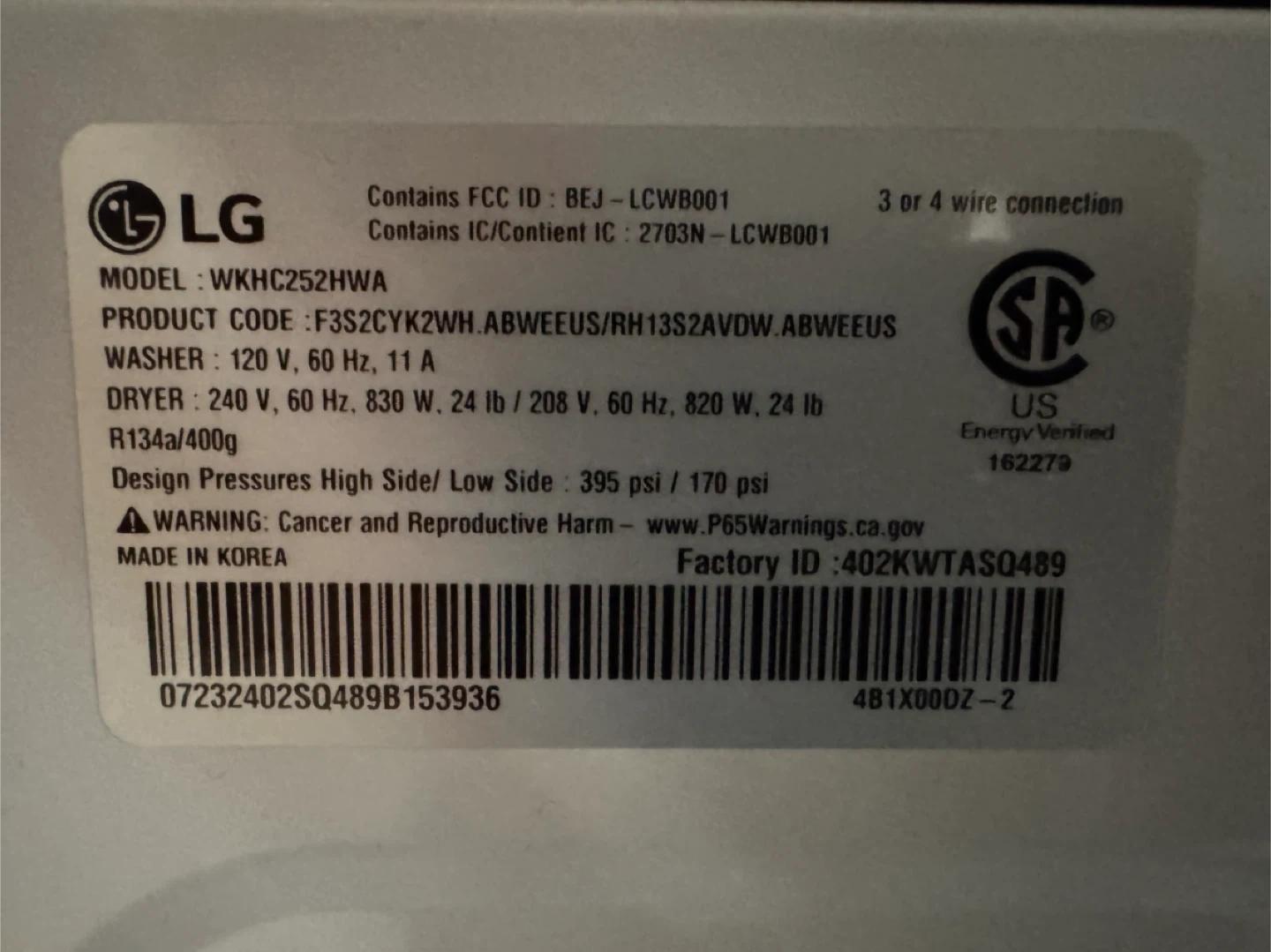 Selling an LG washer and dryer combo. Model number is WKHC252HWA.