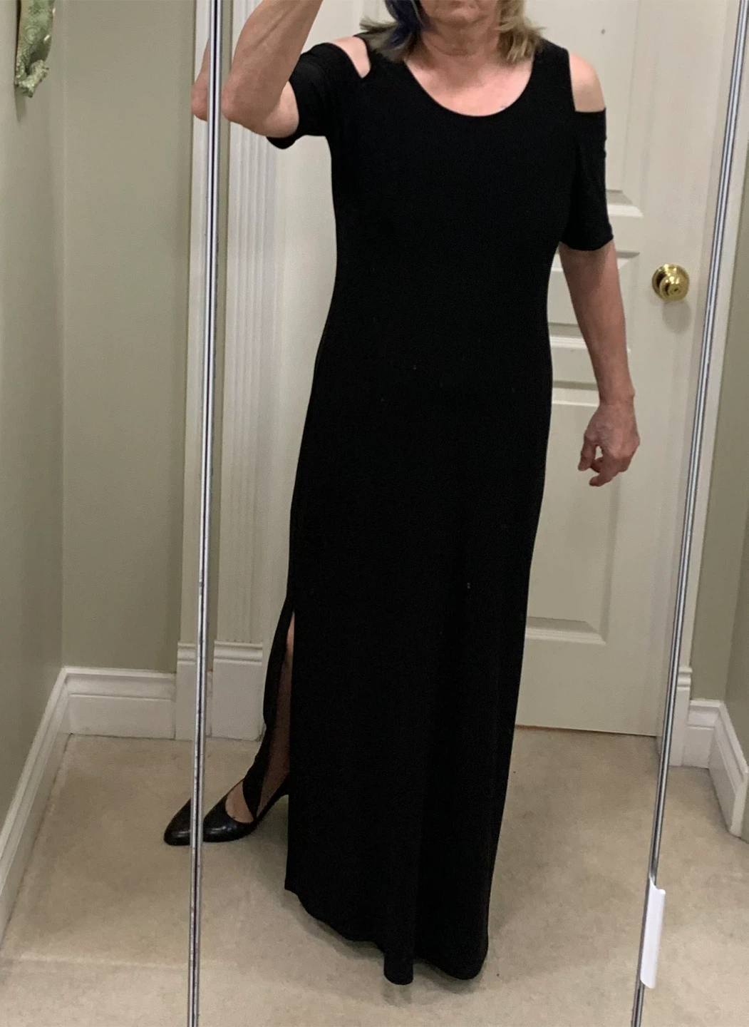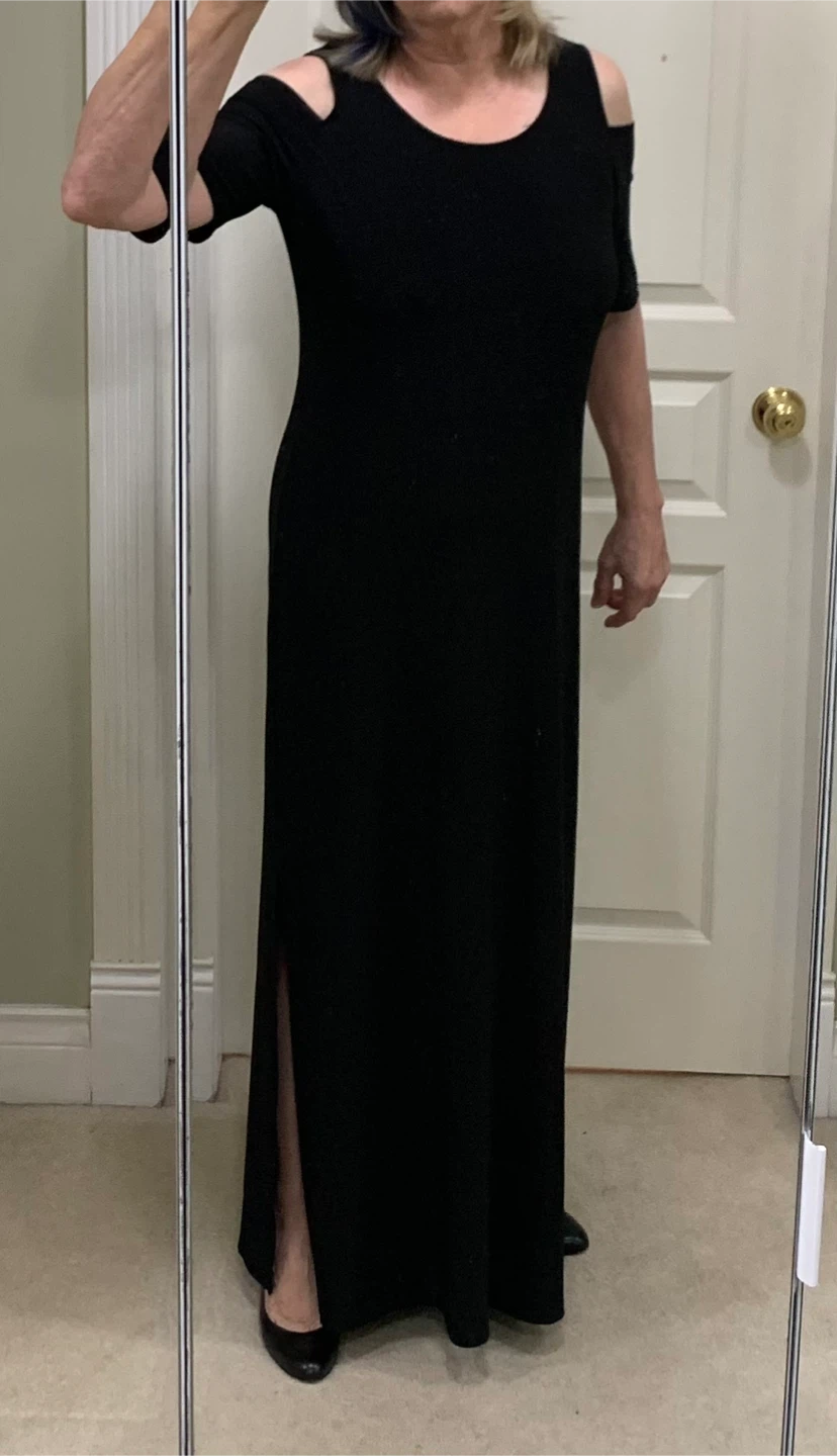 Selling a beautiful black maxi dress from Frank Lyman! It's a size small and in great condition. The dress features a stylish cold-shoulder design and a flattering silhouette. The material is 95% polyester and 5% elastane.