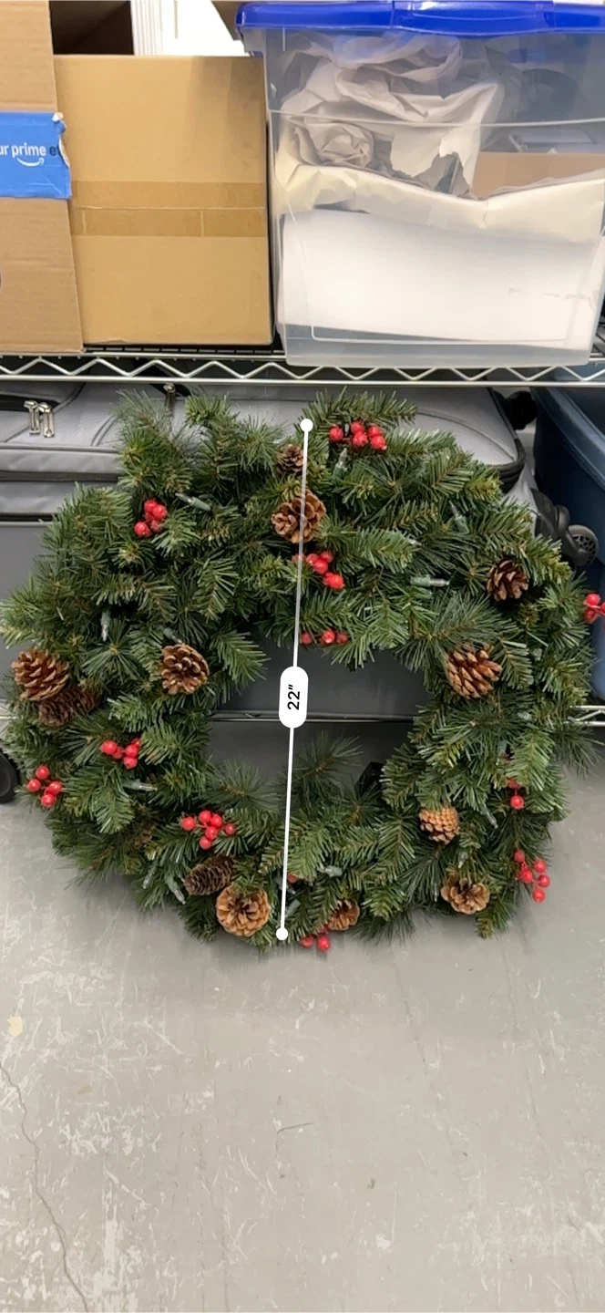 Add some festive cheer to your home with this lovely Christmas wreath! It's decorated with pinecones and red berries, perfect for the holiday season. It measures approximately 22 inches in diameter.
