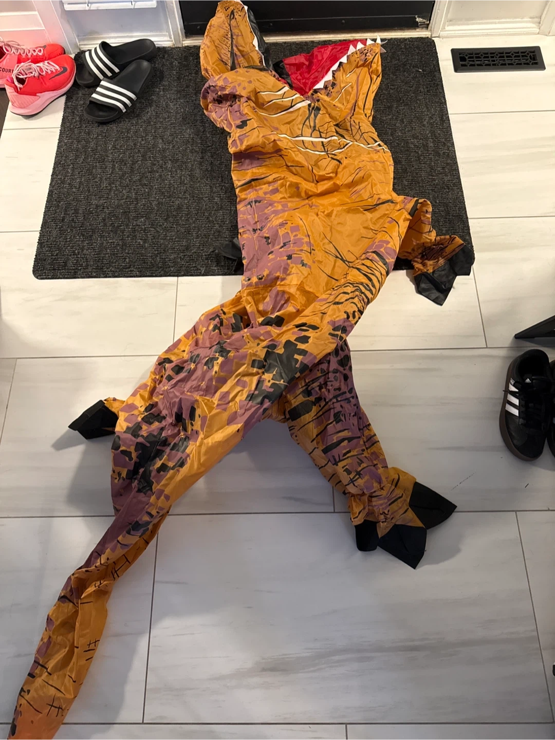 Have some fun with this inflatable T-Rex dinosaur costume! Perfect for Halloween or just goofing around. It's in great shape and ready for a new owner who loves dinosaurs