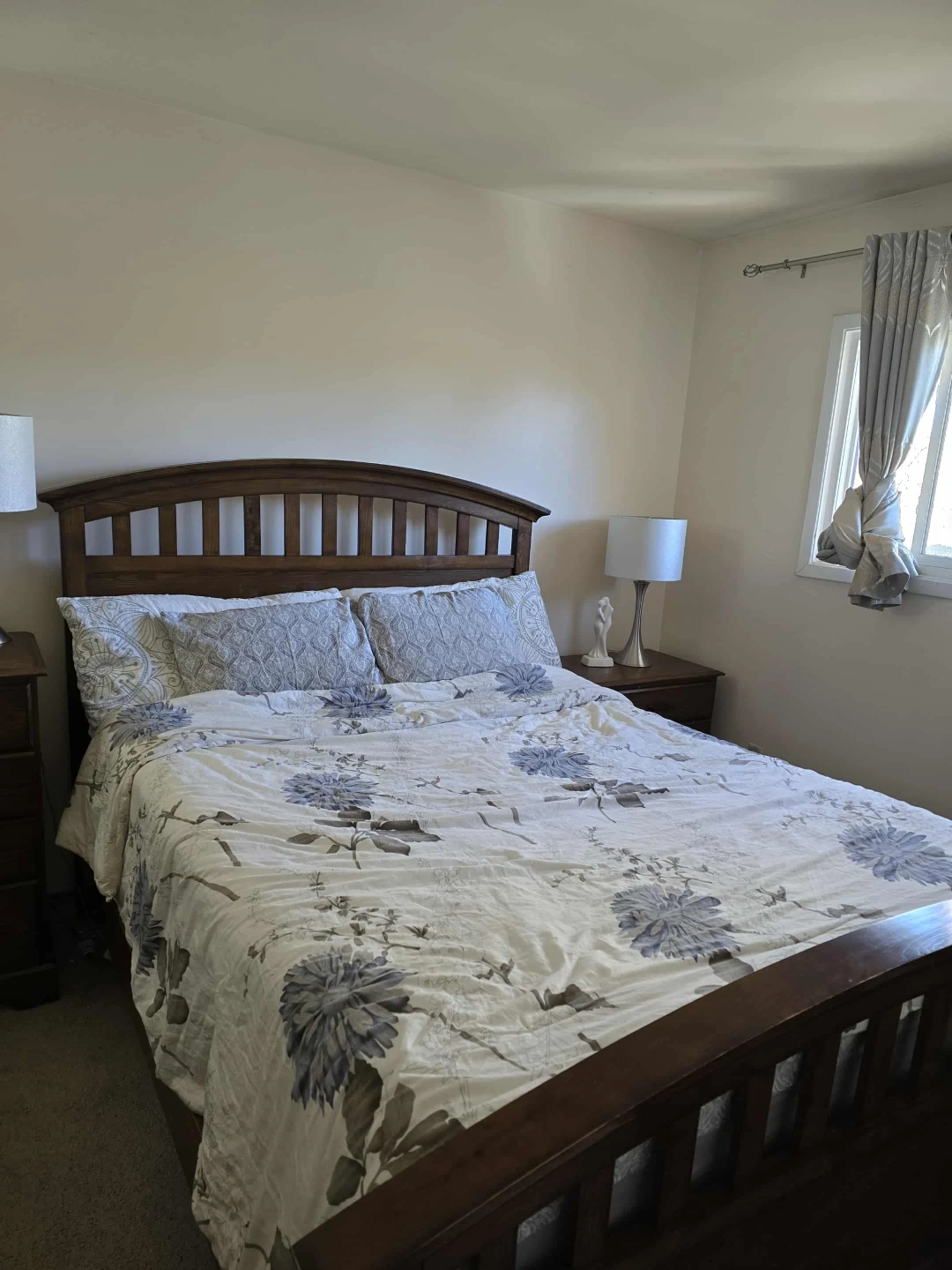 Bedroom set including a dresser with mirror and 2 nightstands. The set is a dark wood colour and in good condition. Perfect to complete your bedroom!