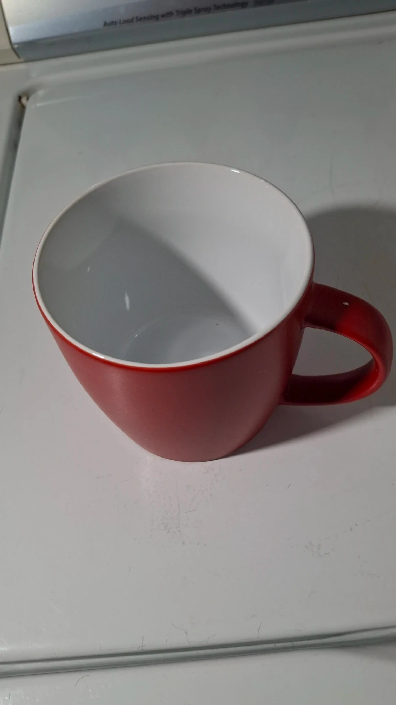 1000+A simple red and white ceramic mug, perfect for your morning coffee or tea! It's in great condition and ready for a new home 4 inch high 4 inch diametet
