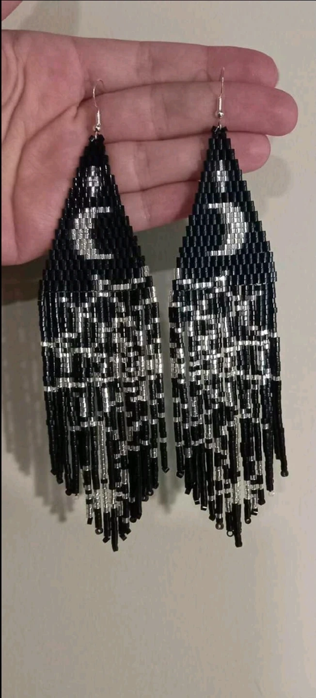 Beautiful handmade beaded fringe earrings! These earrings feature a striking black and silver colour scheme with a unique design. They're perfect for adding a touch of elegance to any outfit.