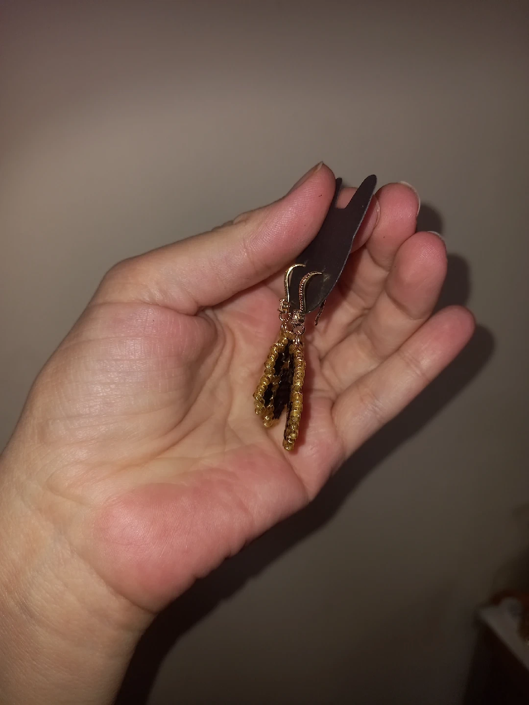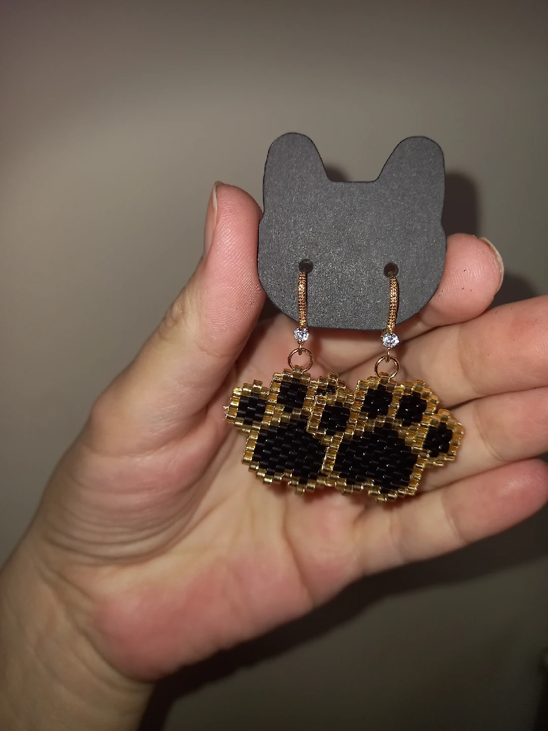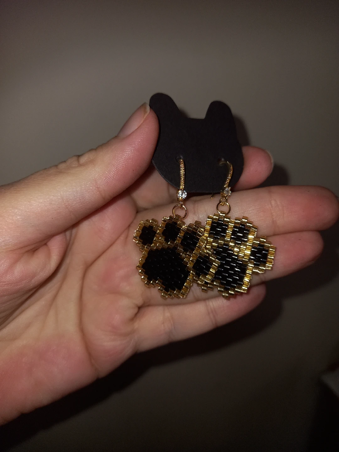 Selling a pair of handmade beaded earrings in a paw print design! They are black and gold and have a small clear bead at the top. They are in great condition and would make a cute gift for an animal lover