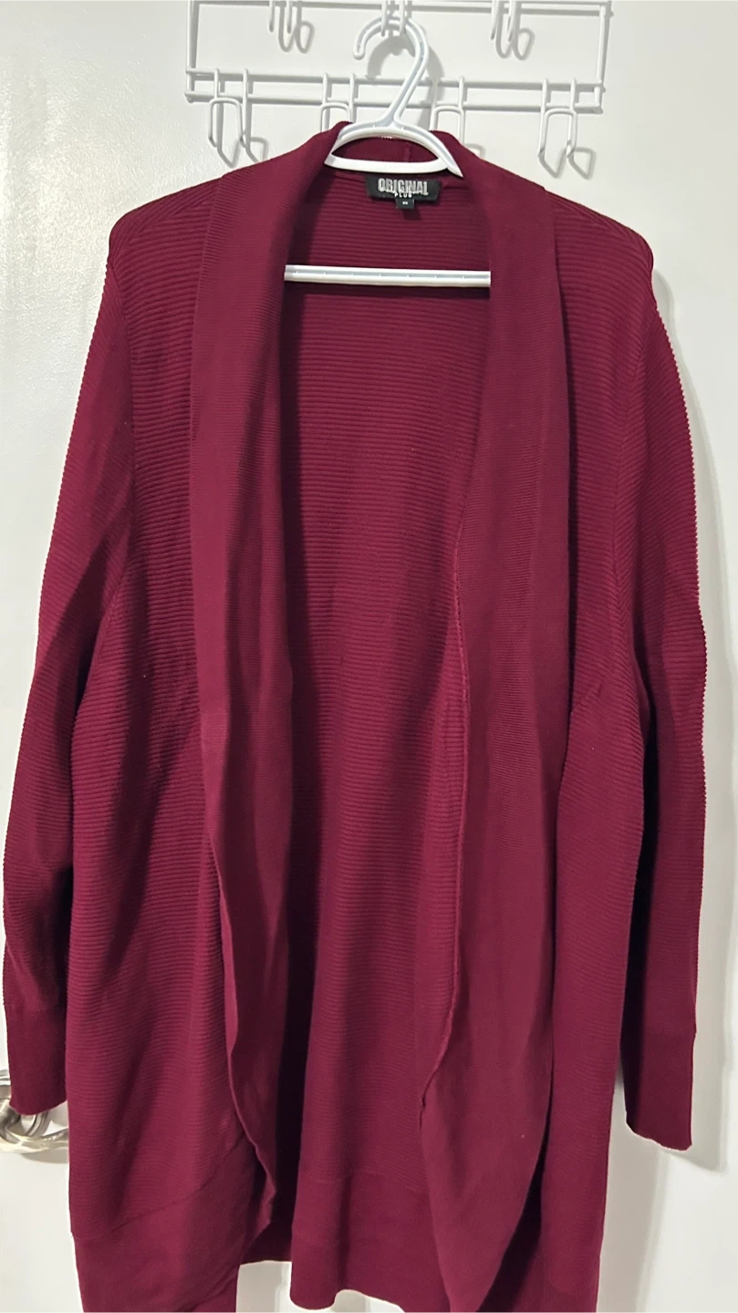 I’m selling a burgundy cardigan from Nicole Miller Original Plus in size 3X.