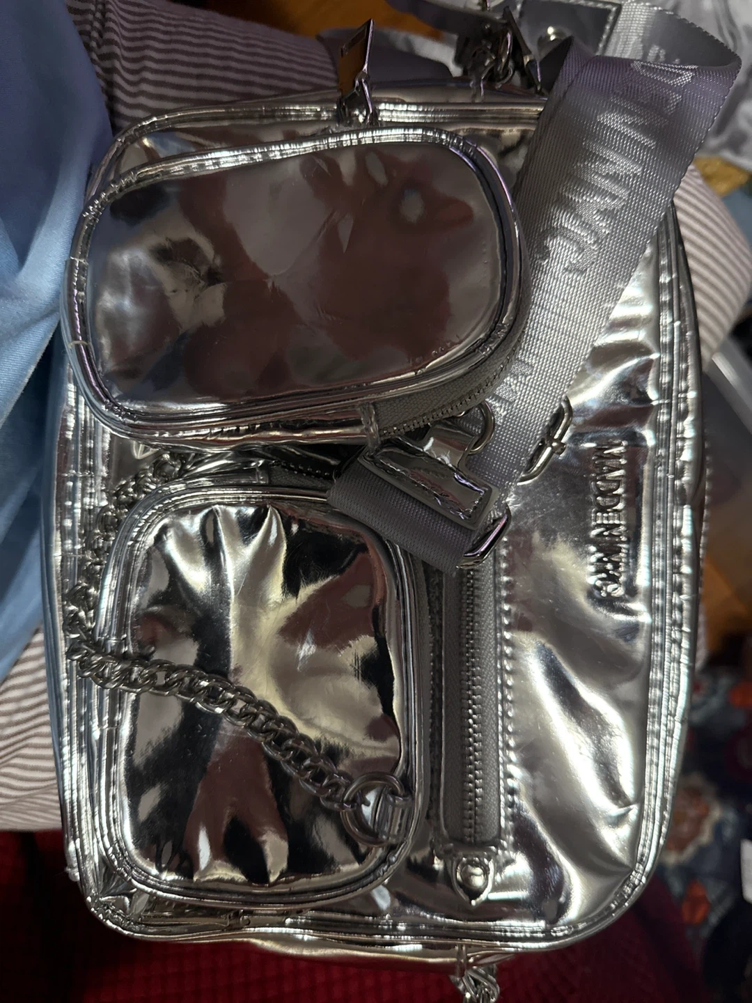 This is a cute Madden Girl silver mini backpack! It's perfect for carrying your essentials in style. The backpack features multiple compartments and a chain detail.