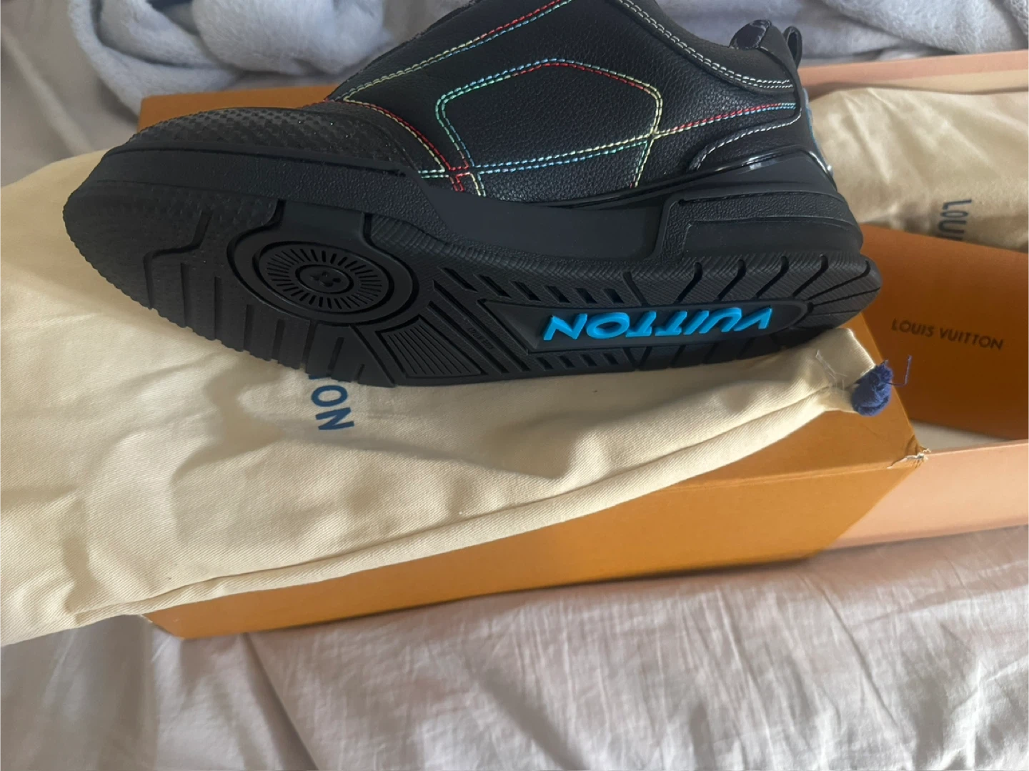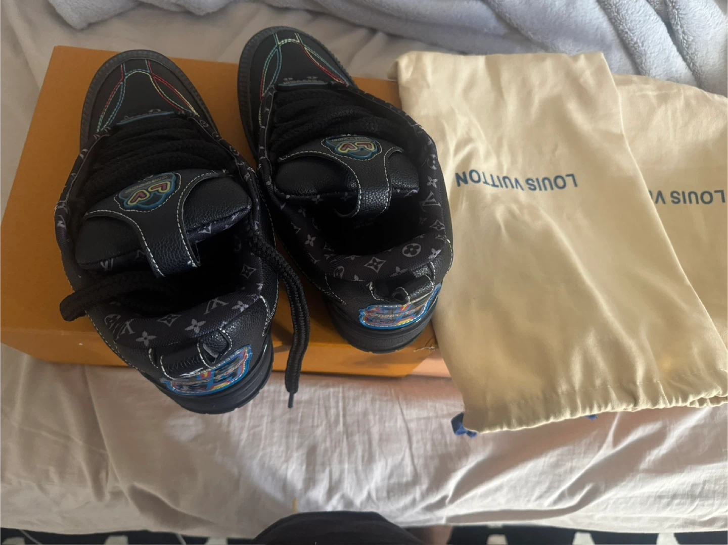 Selling a pair of Louis Vuitton sneakers in black leather. Comes with the original box and dust bags! size 11