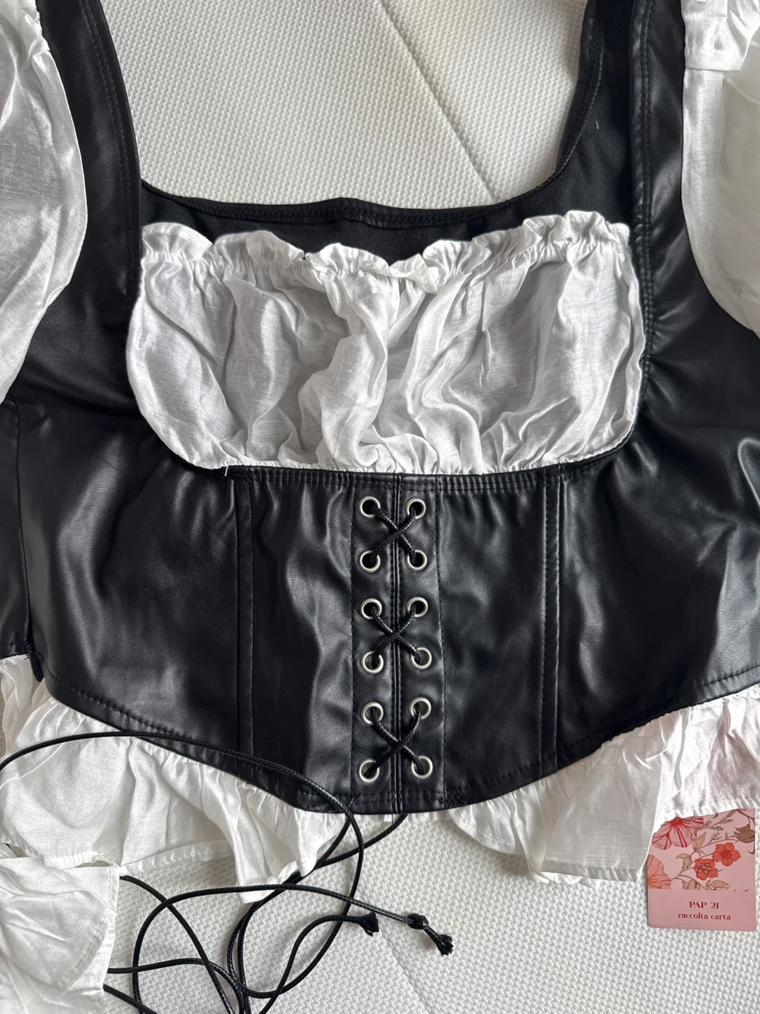 121A stylish black and white corset top, perfect for adding a unique touch to your wardrobe! The design features a corset-style front with lace-up detailing and puffy sleeves. It's in great condition am b la lassand ready for a new home