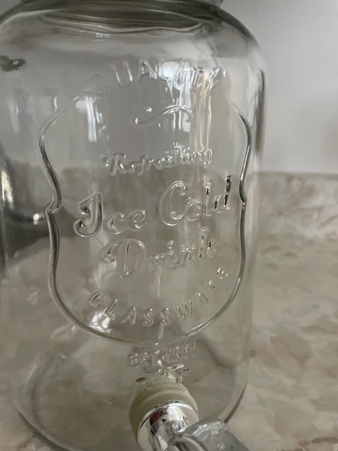 This is a glass beverage dispenser with a spigot, perfect for serving iced drinks! The glass has a design that says "Ice Cold Drink" on the front. It's in great condition and ready to use at your next gathering.