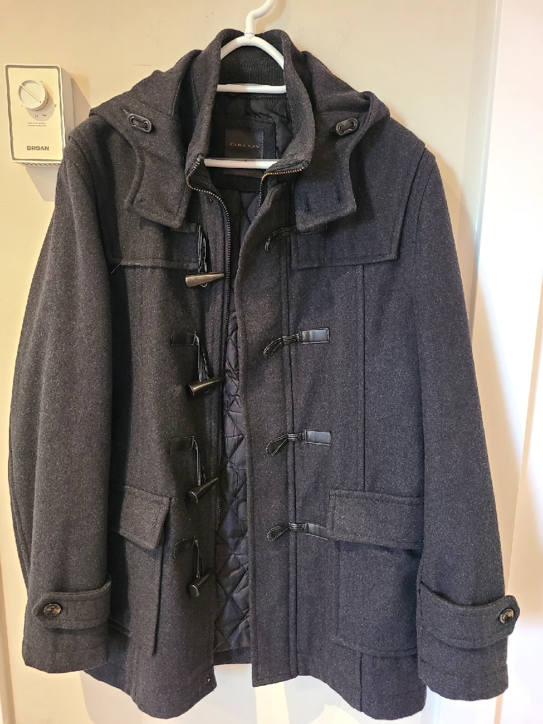 Here's a Zara Man duffle coat in size L. It's a stylish and warm coat, perfect for the colder weather. The coat features a hood and toggle closures. It’s in great condition!