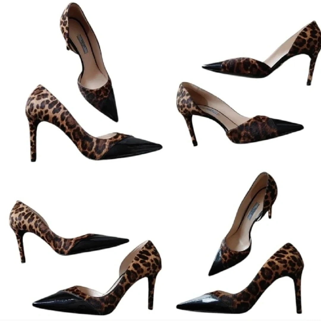 Authentic Prada Pony Hair Leopard Print Patent Leather High Heels.