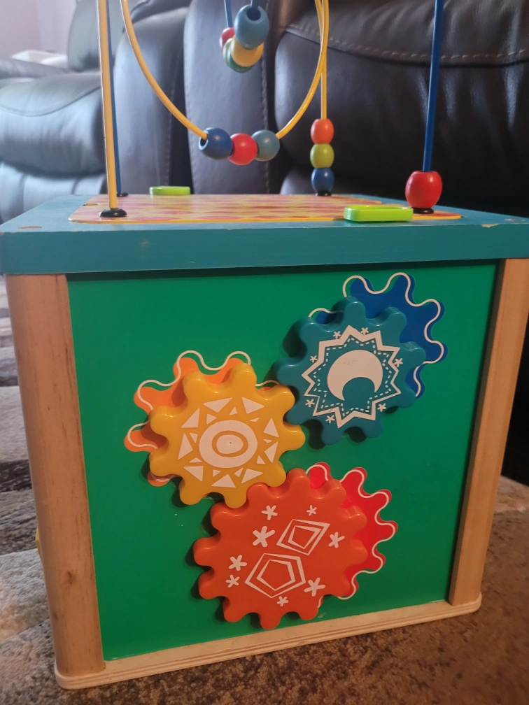 This fun wooden activity cube is perfect for keeping little ones entertained! It features a variety of engaging activities on each side, including animal-themed mazes, a clock face for learning to tell time, and spinning gears.