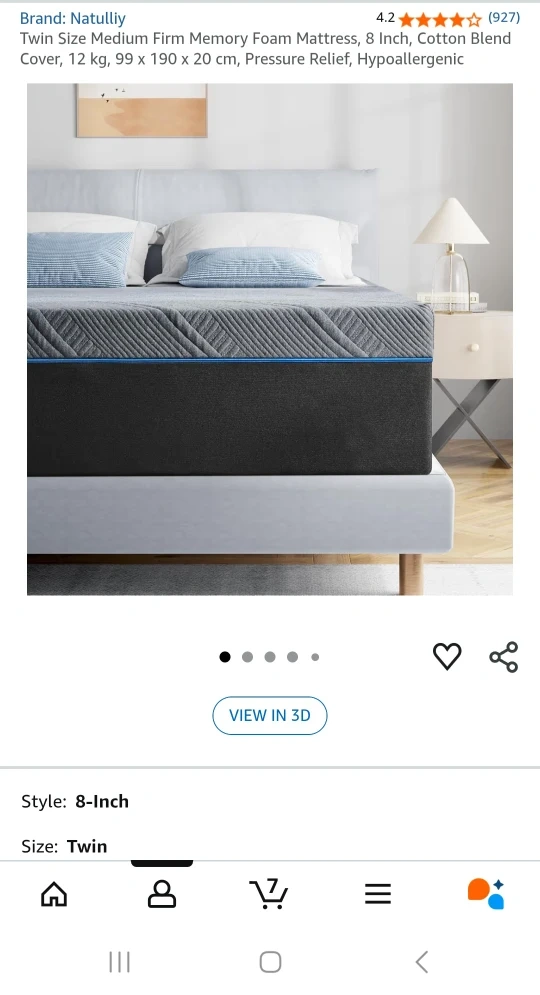 Selling a Natulily twin-size memory foam mattress. It's 8 inches thick and comes with a cotton blend cover. It's designed for pressure relief and is hypoallergenic. The dimensions are 99 x 190 x 20 cm. It features 2" cool gel memory foam, 1" high-density comfortable foam, and a 5" HD support base foam.