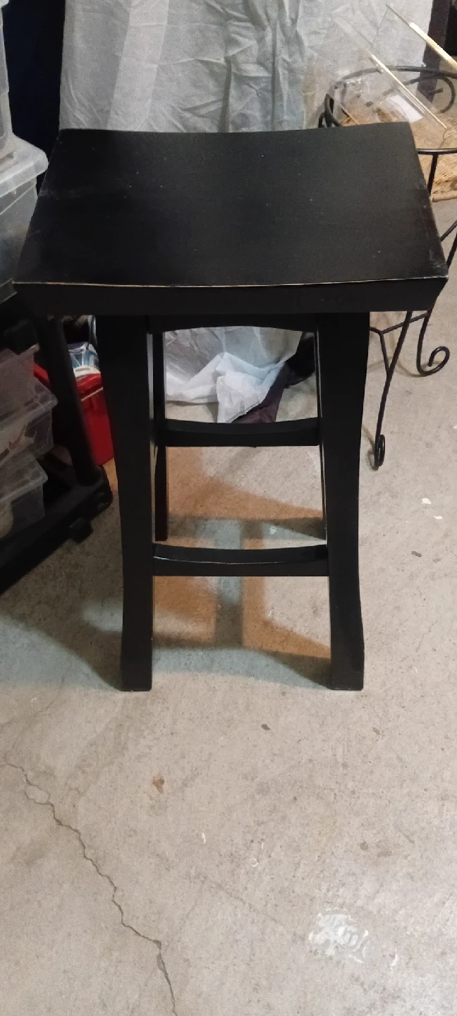 Selling a black wooden bar stool in good condition! It's a sturdy piece that could be used in any room of the house. Perfect for beside a couch or bed!
