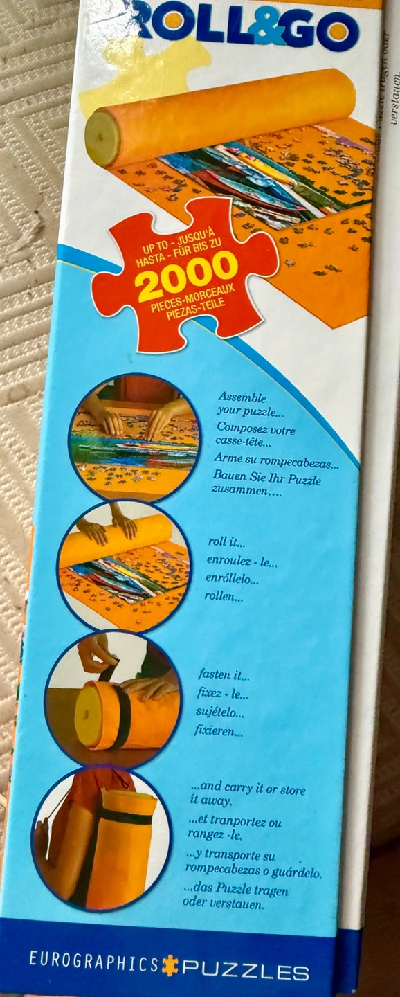 Keep your jigsaw puzzles safe and organized with this EuroGraphics Smart Puzzle Roll&Go storage system, designed for puzzles up to 2000 pieces. This handy system includes a non-slip felt mat measuring approximately 30" x 50" (76.2 cm x 127 cm), an inflatable tube, and securing straps, making it easy to roll up and transport your puzzle in progress. This item is used but in very good condition. * **Mat Size:** 30" x 50" (76.2 cm x 127 cm) * **Capacity:** Up to 2000 pieces * **Includes:** Felt mat, inflatable tube, straps Looking to keep your puzzle masterpieces safe? This is the perfect solution. Remember, if the ad is up, it's available!