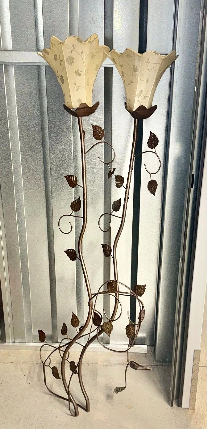 Serious buyers only. Please be ready to purchase. No lowball offers. Metal Floral Floor Lamp – Bronze Vine Design with Dual Cream Shades Add a touch of elegance to your home décor with this metal floral floor lamp. Designed with graceful vine stems and detailed bronze leaves, it features two petal-shaped cream shades that provide a soft, warm glow. Ideal as a statement accent piece for a living room, hallway, or bedroom. Item Details: Dual light fixtures with cream floral-pattern shades Decorative metal vine and leaf design with bronze finish Plug-in ready and fully functional Suitable for vintage, boho, or classic-style interiors Approximate height: 5 ft tall Condition: Gently used, in great shape Pickup & Delivery: Local pickup in the Bronx Local delivery available within the Bronx (delivery fee based on distance) Payment Accepted: Cash Zelle Cash App Deposit Policy: Deposits secure the item and are applied to the total price Remaining balance is due at pickup or delivery No holds without a deposit If picking up today or tomorrow, a deposit is not required