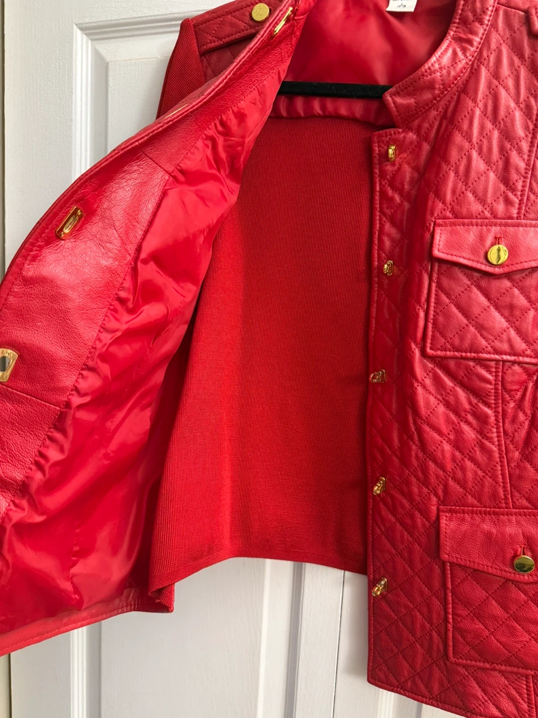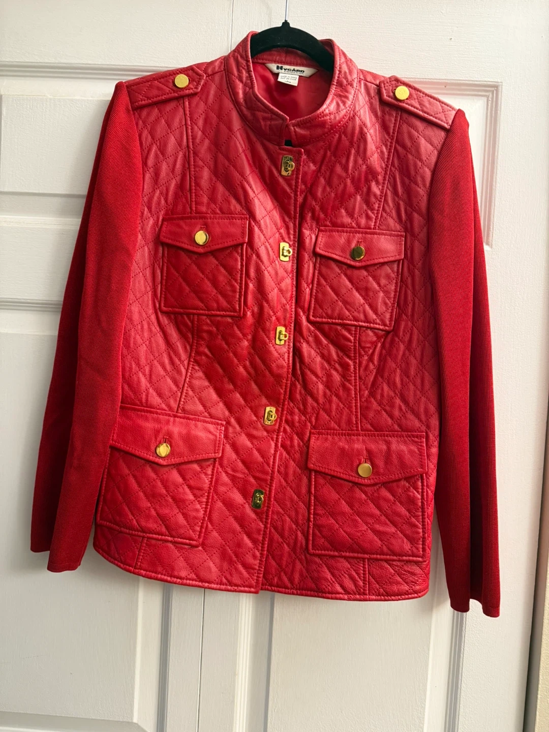 Here's a stylish red leather jacket from the Nygard Collection! It's a size L and would make a great addition to your wardrobe. The jacket features a quilted design and gold button accents.