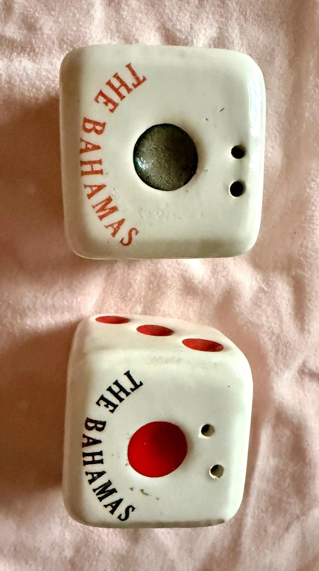 Spice up your dining experience with this novelty set of ceramic dice salt and pepper shakers, a charming souvenir from The Bahamas. These used shakers are in good condition, ready to bring a touch of whimsy to your table. This playful pair is sure to spark conversation and add a dash of fun to any meal. * Material: Ceramic * Design: Dice with Bahamas print * Condition: Used If the ad is up, they're still available!