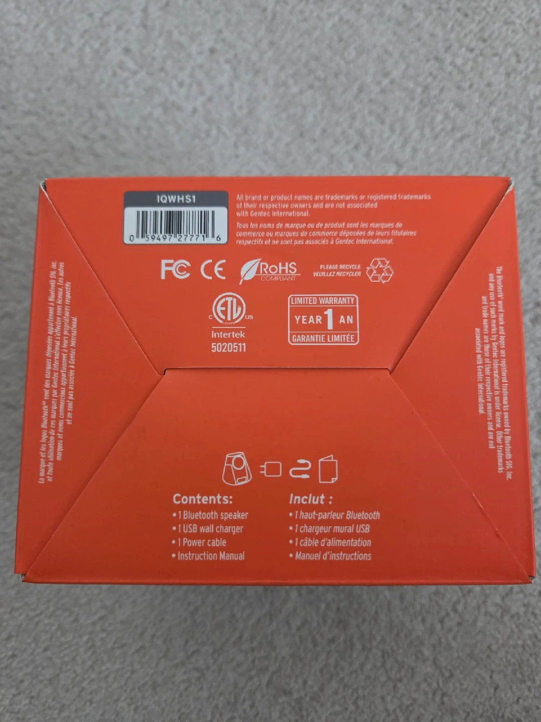 Includes: Bluetooth speaker, USB wall charger, power cable, and instruction manual