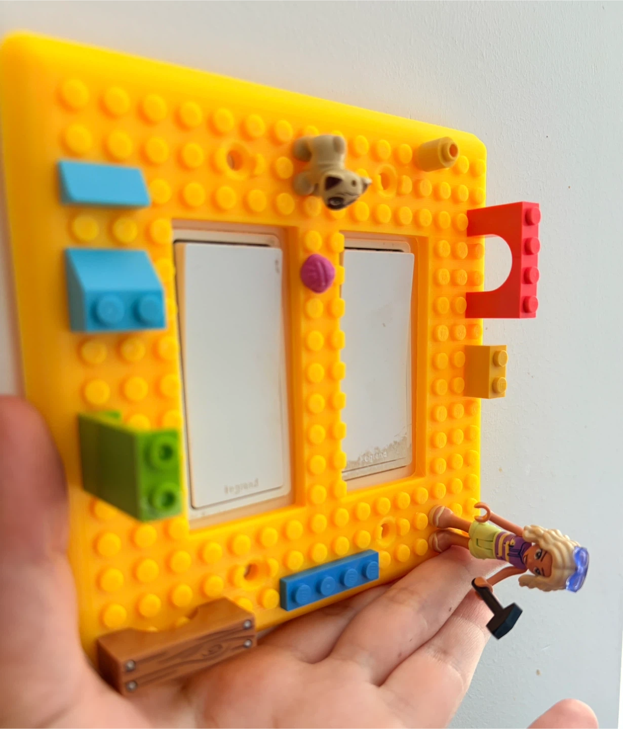 This bright yellow light switch plate cover is designed to look like Lego bricks! It fits over a standard double light switch and includes several decorative Lego-style pieces and mini-figure accessories. Great for a kid's room!