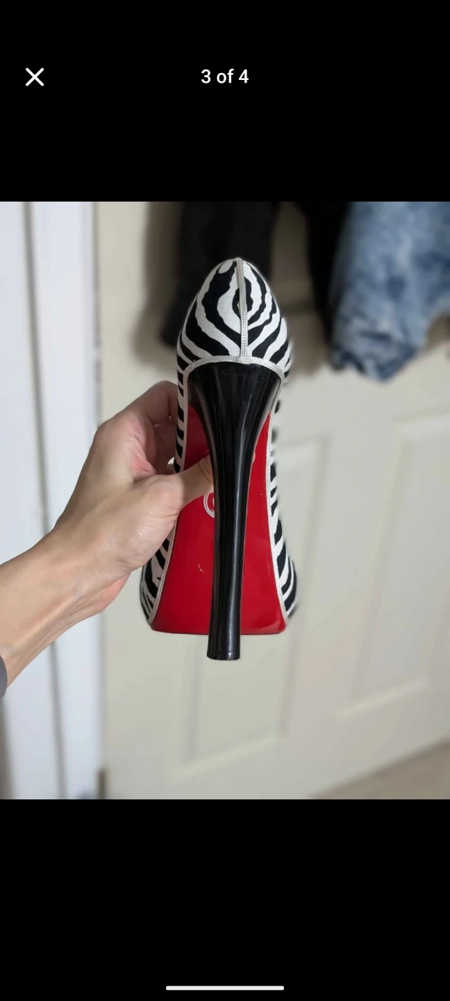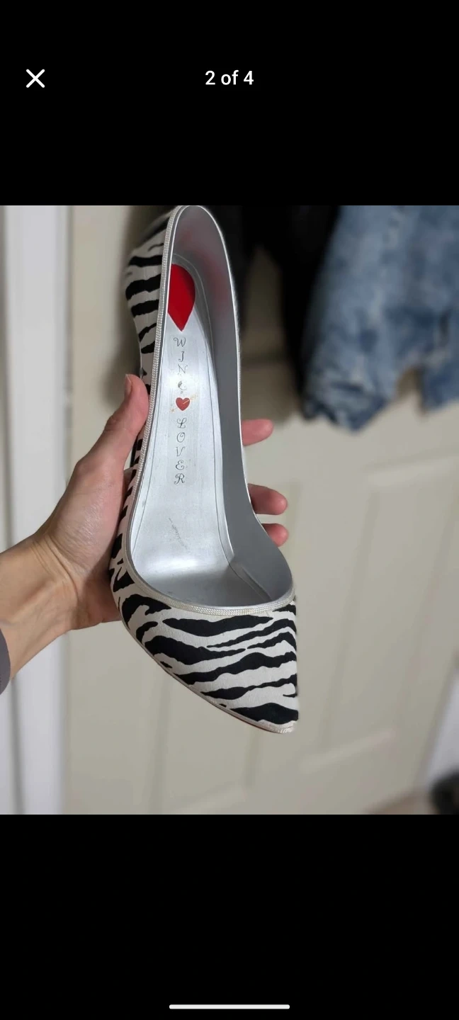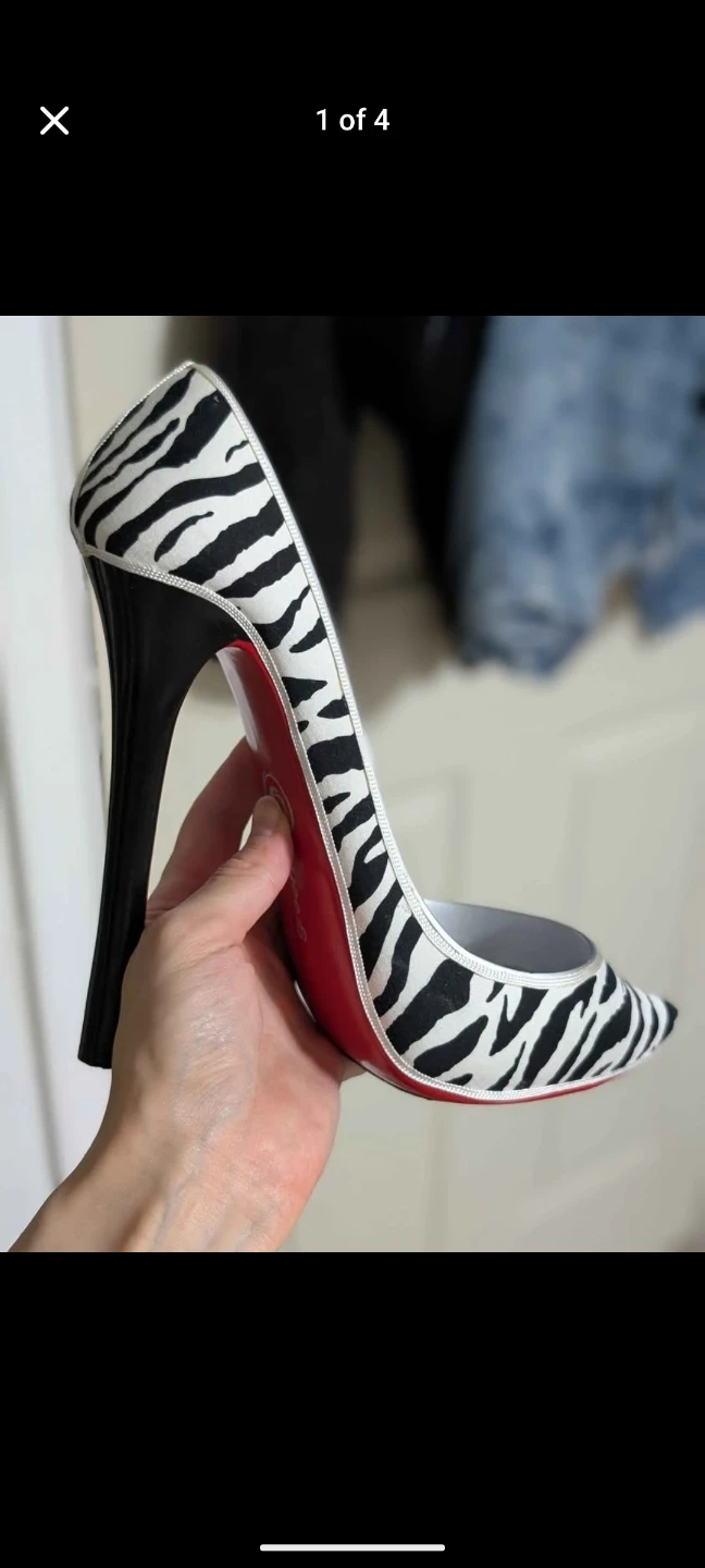 This is a novelty high heel wine bottle holder. It has a zebra print design and a red sole detail. It's a fun conversation starter for your wine collection!