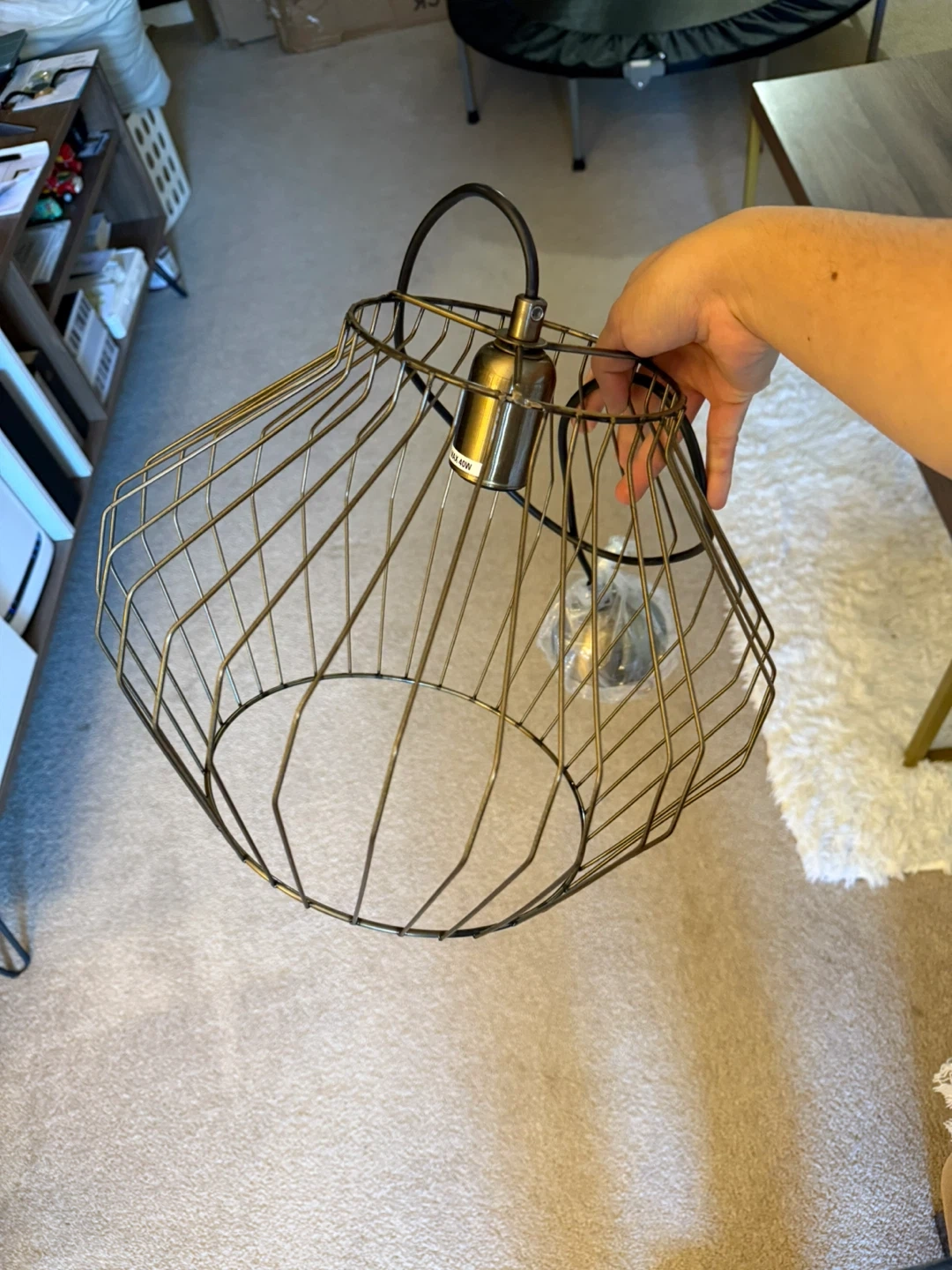 Here's a stylish wire cage pendant light fixture. It's perfect for adding a modern, industrial touch to any room. It is in great condition and ready to brighten up your space.